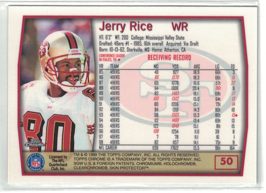 | Description: | Jerry Rice | | Category: | Football | | Year: | 1998 | | Product: | Topps Chrome | | Team: | San Francisco 49ers | | Card Number: | 38 | | Dimensions: | 3½" x 2½" |