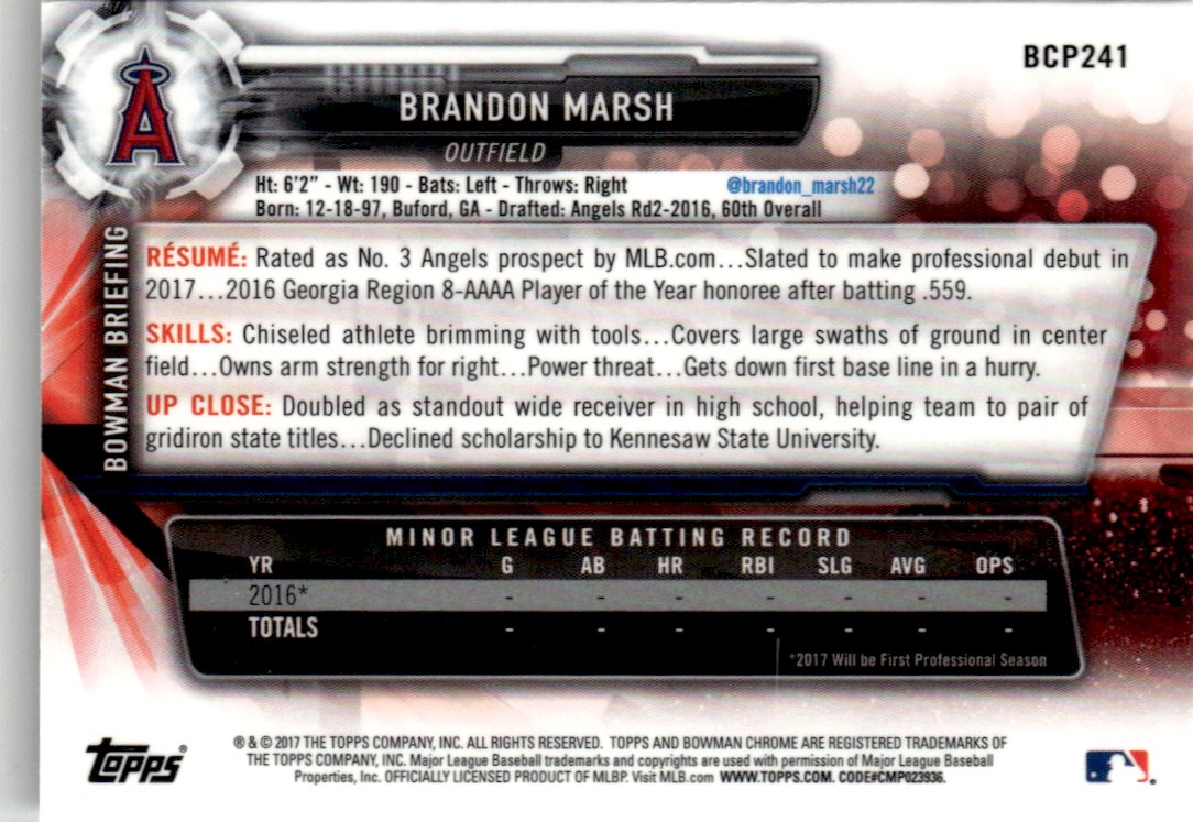 | 2017 Bowman Chrome Brandon Marsh RC Los Angeles Angels #BCP241 |