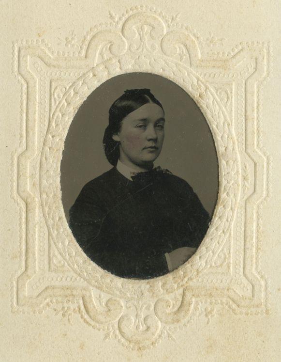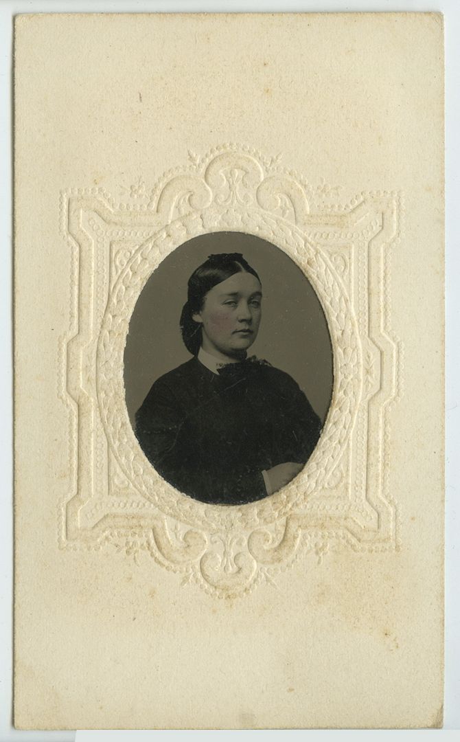 Beautiful young lady posed with a very slight side glance. Blue eyes and a bow or braid at the top of her head. Unusual paper mount offered an embossed front and a gilt printed back as a choice of display.
