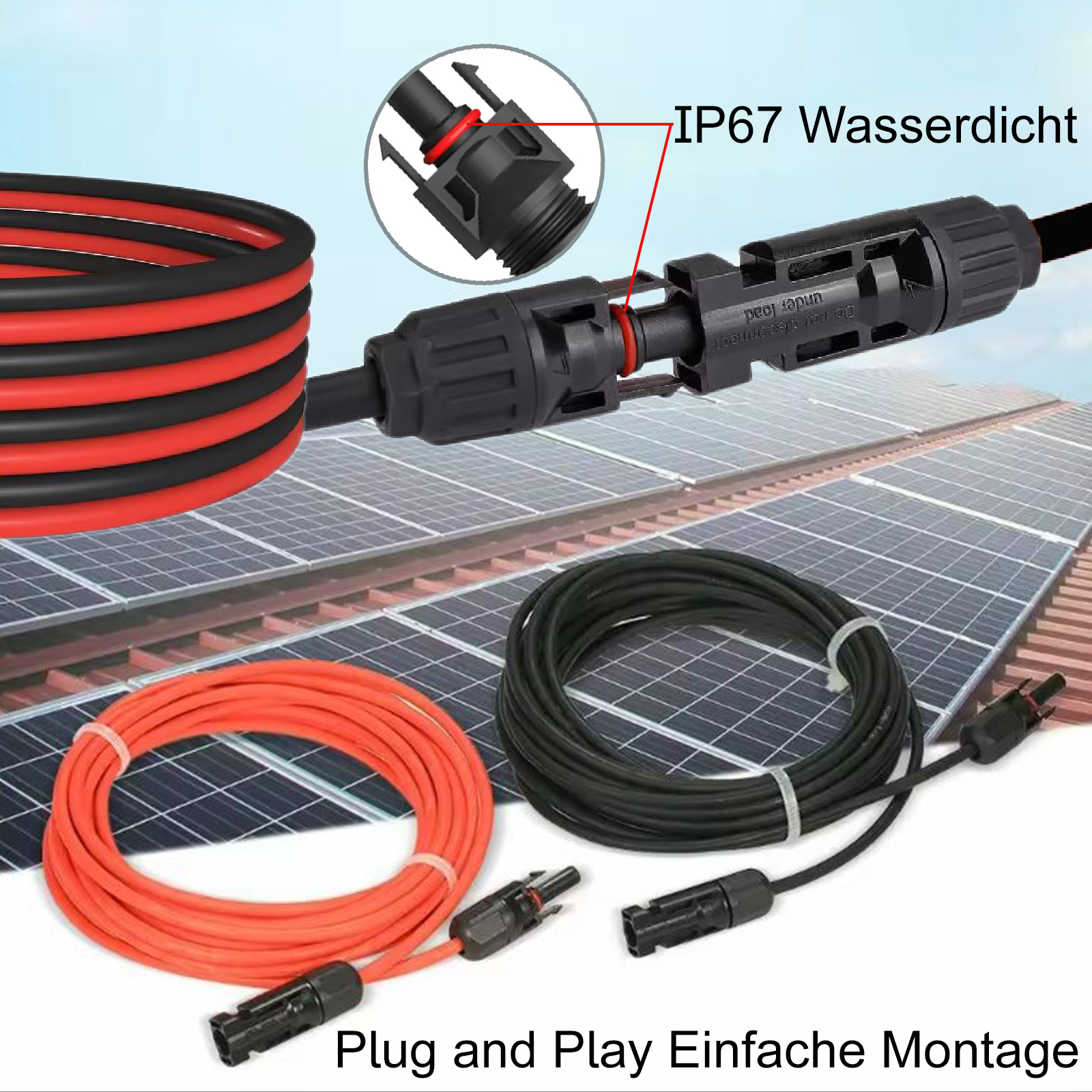 PV Stecker / Buchse mit einem stabilen selbsthemmenden System, das leicht zu verriegeln und zu öffnen ist: Kompatibilität mit allen gängigen Photovoltaikkabeln von 2,5-6,00 mm²