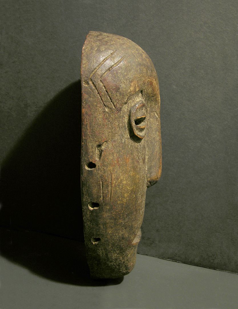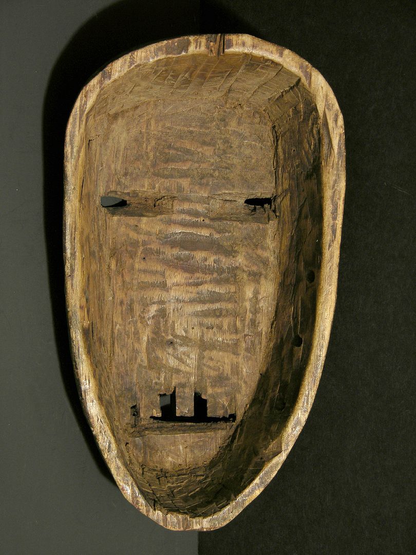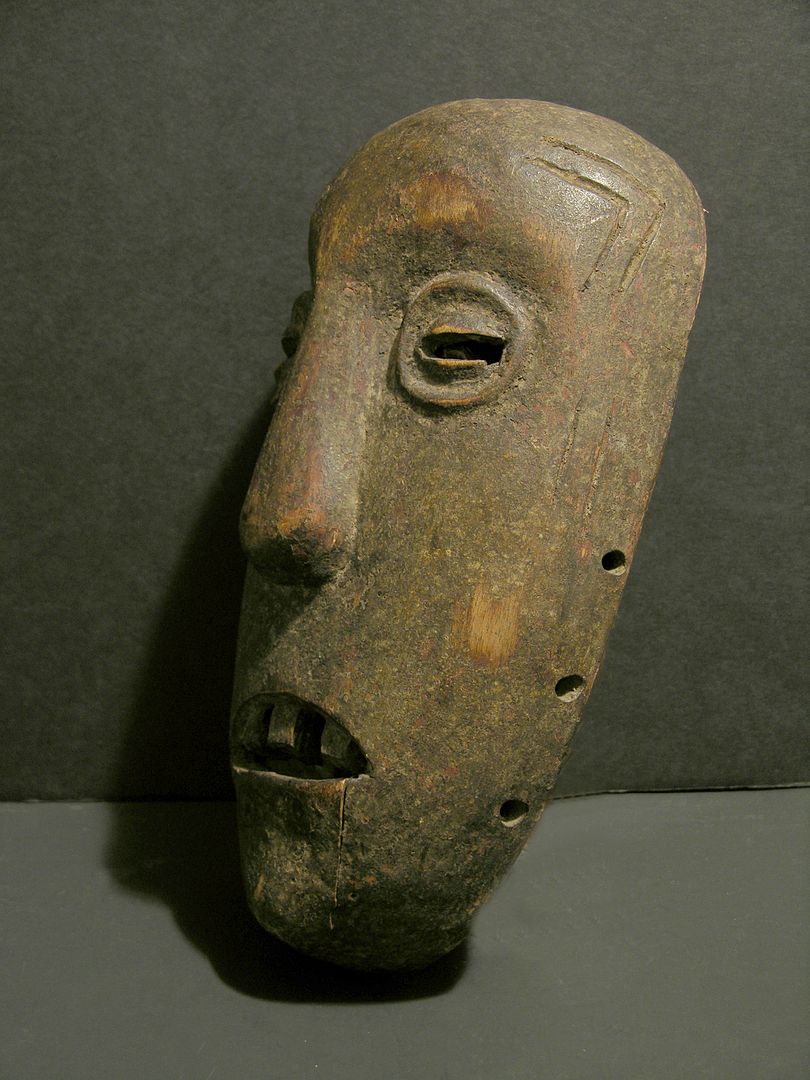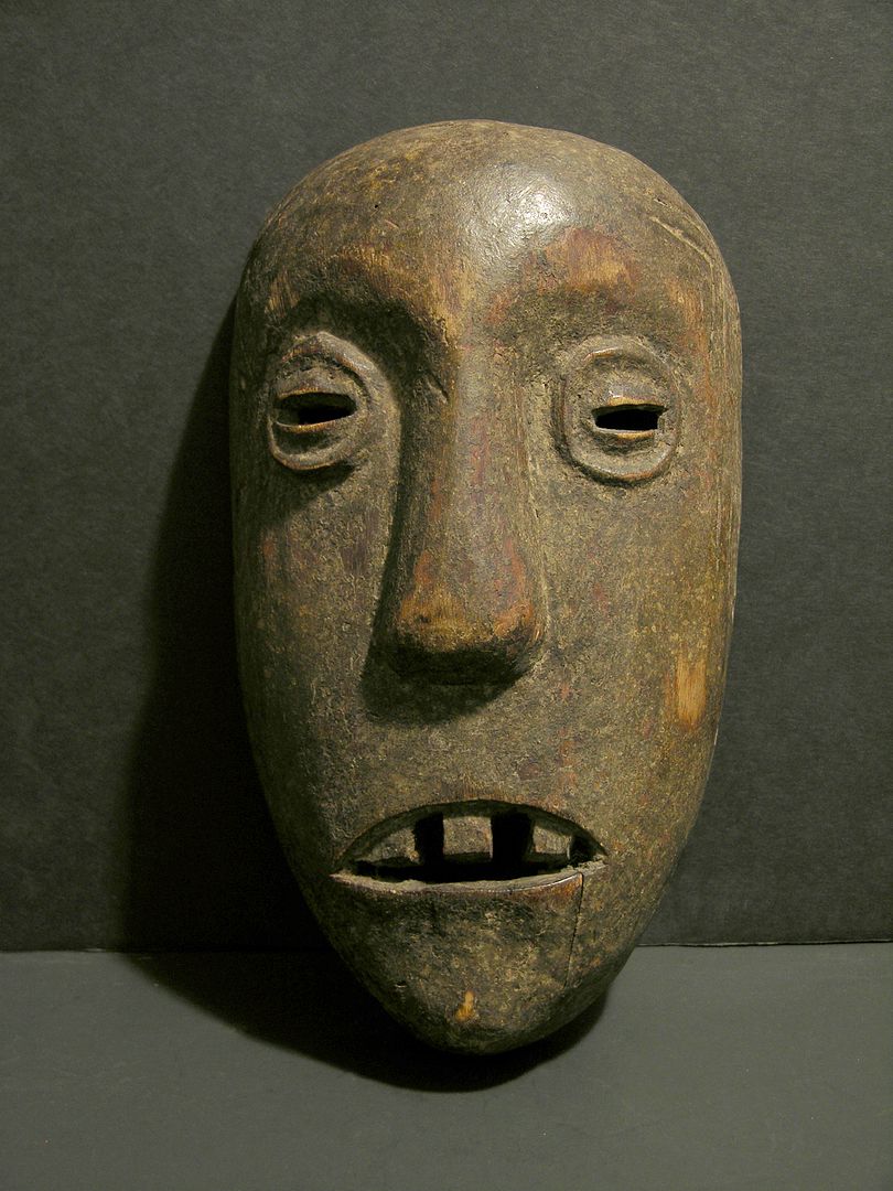 Unusual and early 20th Century Makonde dance mask from Tanzania, Africa. Uncommon toothy frown with bulbous slit eyes and broad nose. Several simple tattoo/scarification designs at the side of the eyes and cheeks. Age stress crack at the bottom lip into chin, beautiful aged patina. Measures 12 ¼ inches high by 7 inches wide by 3 ½ inches deep.