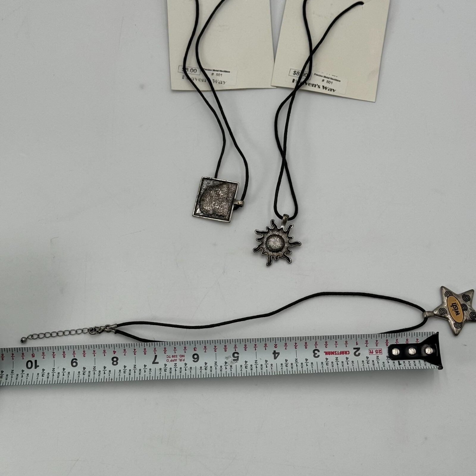 The necklaces are 18 inches long and feature a variety of styles, including peace, sun, and joy.
