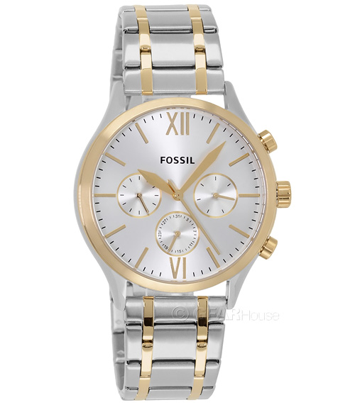 The FOSSIL 'Fenmore' men's multi-function watch combines durable construction with a luxurious two-tone finish, making it a stylish choice for everyday wear. The silver dial features gold accents, minimal markings for a sleek look, and three functional sub-dials displaying the day of the week, date, and 24-hour format. Completing the look, the stainless steel link bracelet is crafted with a refined mix brushed and polished finishes, adding an upscale touch, and it secures with a push-button folding clasp. With a 44mm case width, this timepiece offers a sleek & modern fit. Brand new with tags, includes FOSSIL watch box. Original MSRP: $195.
