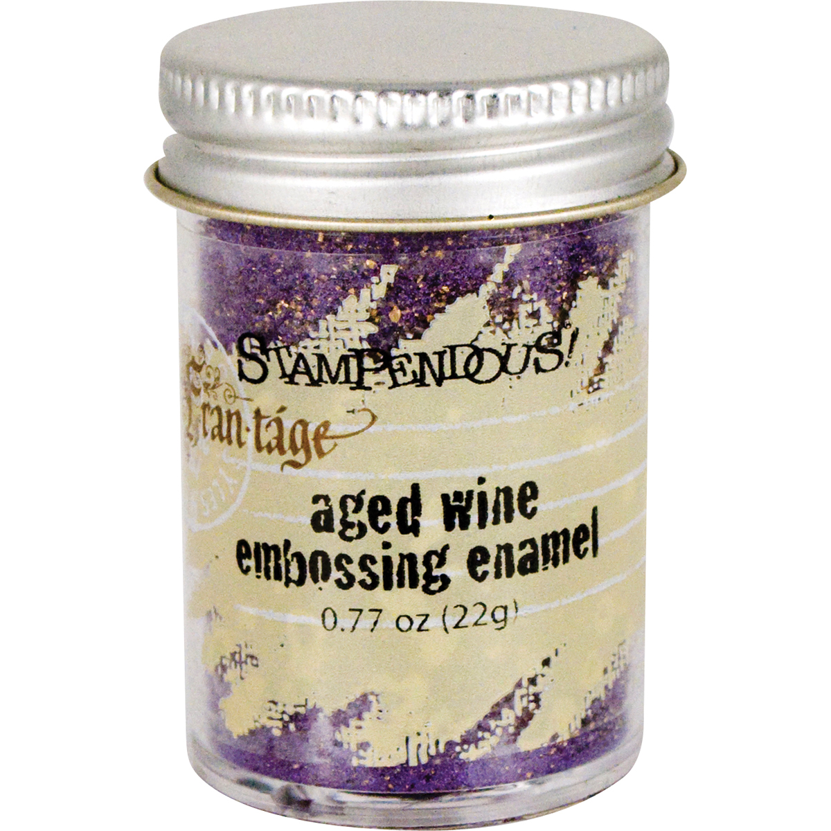 STAMPENDOUS-Aged Embossing Enamel. A chunky vintage-inspired embossing powder that accepts glitter and mica well and provides a thick layer of enamel to projects. For best results use a slow- drying ink and heat from the underside. This package contains 0.77 ounces (22g) of embossing powder. Color: Wine. Made in USA.