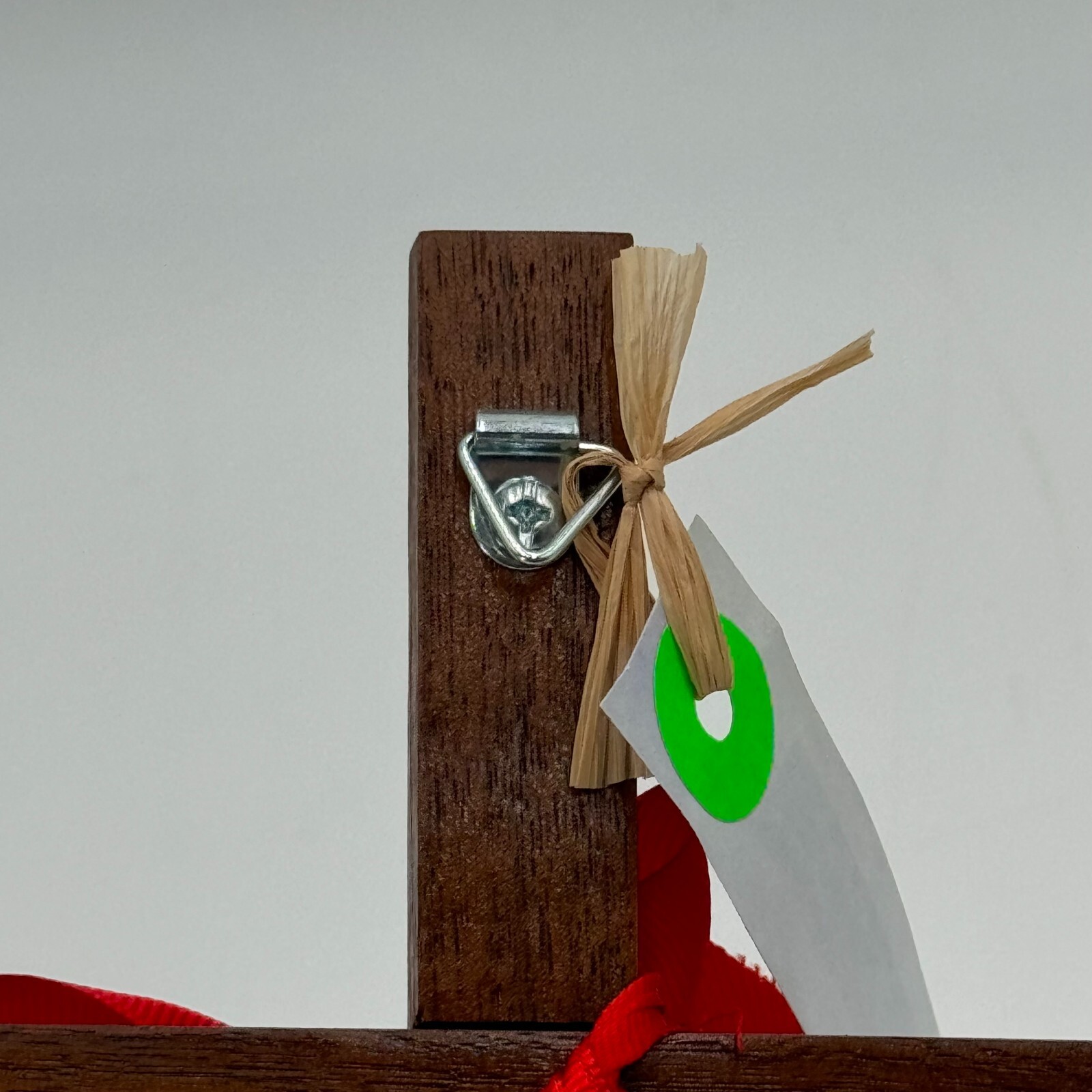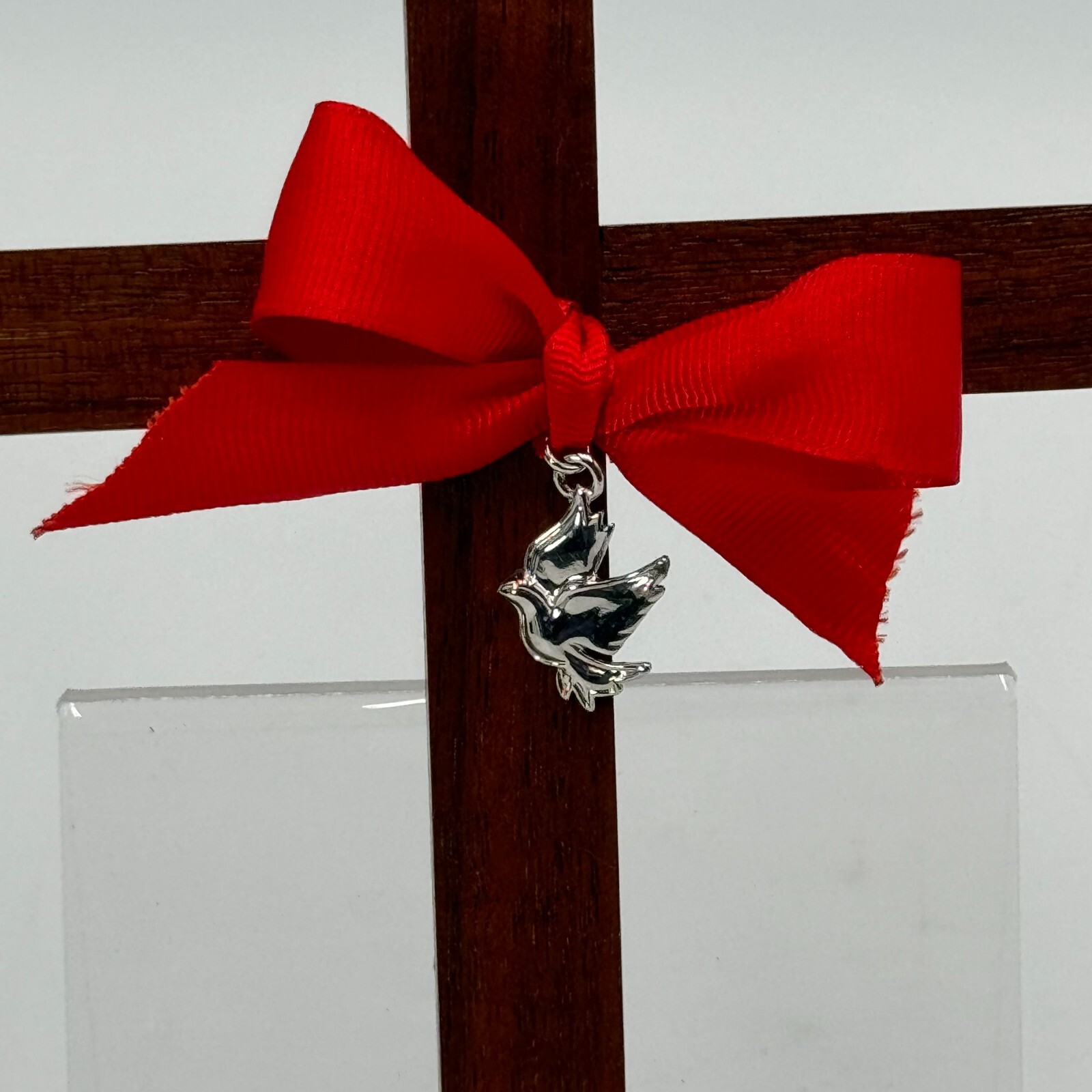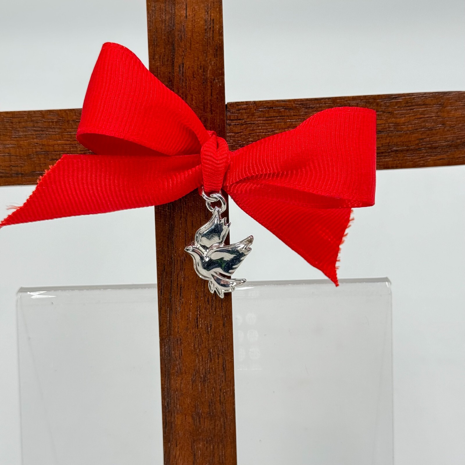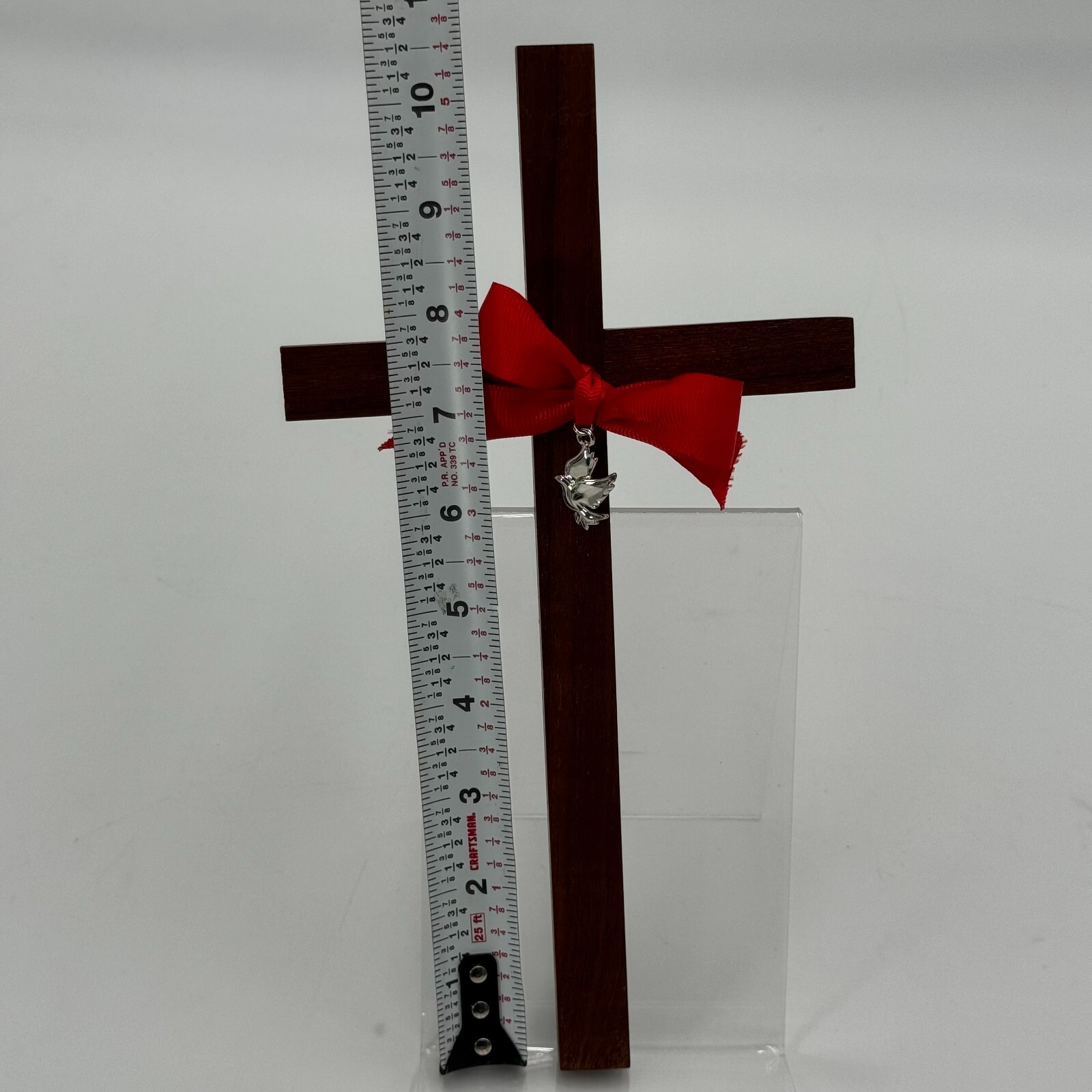 The intricate design features a red ribbon and silver dove, adding a touch of elegance to this holy piece. Measuring at 11 inches, it is ideal for display on a wall in your home or office.
