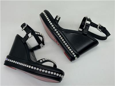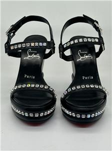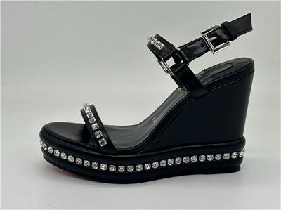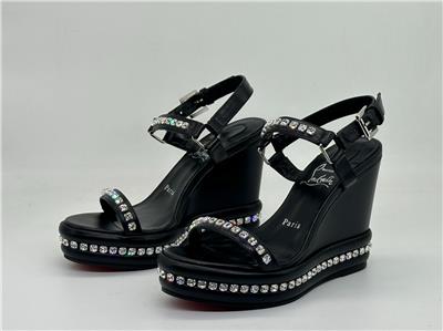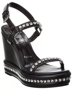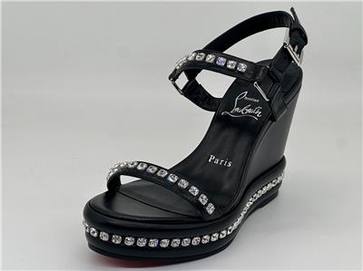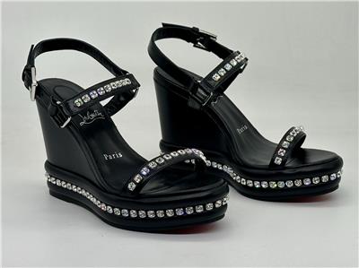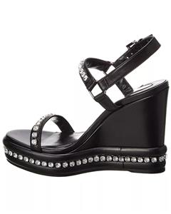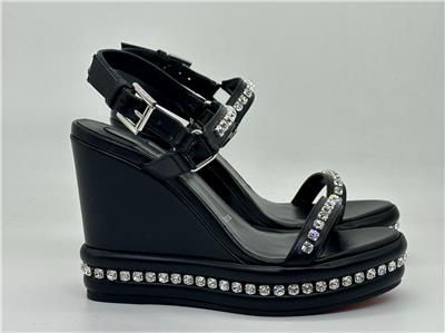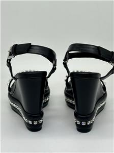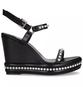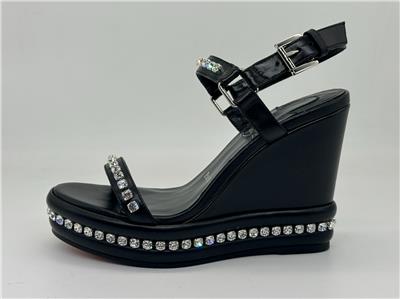 Pyrastrass 110 Wedges in black leather with crystal embellished straps, crystal studs detail around the wedge.