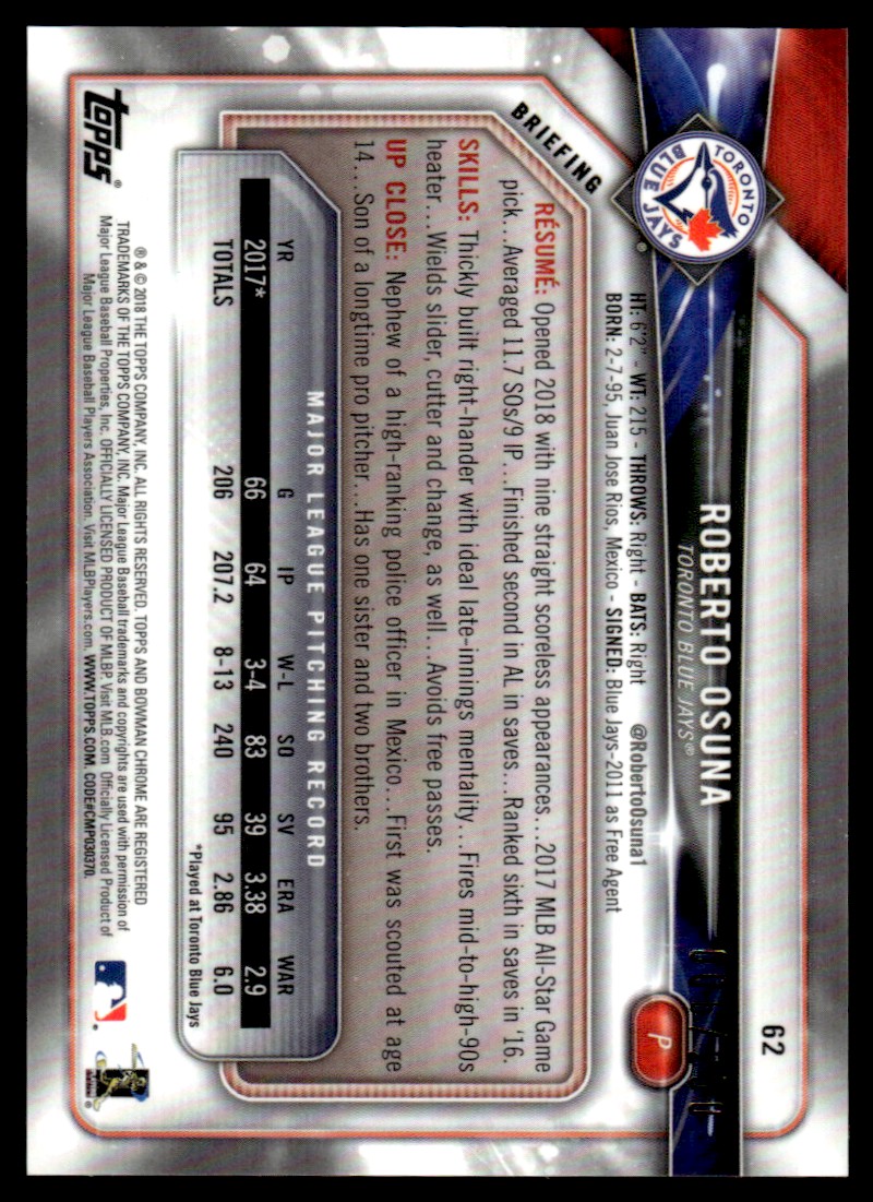 | 2018 Bowman Chrome Roberto Osuna /250 Toronto Blue Jays #62 *Noles2148* |