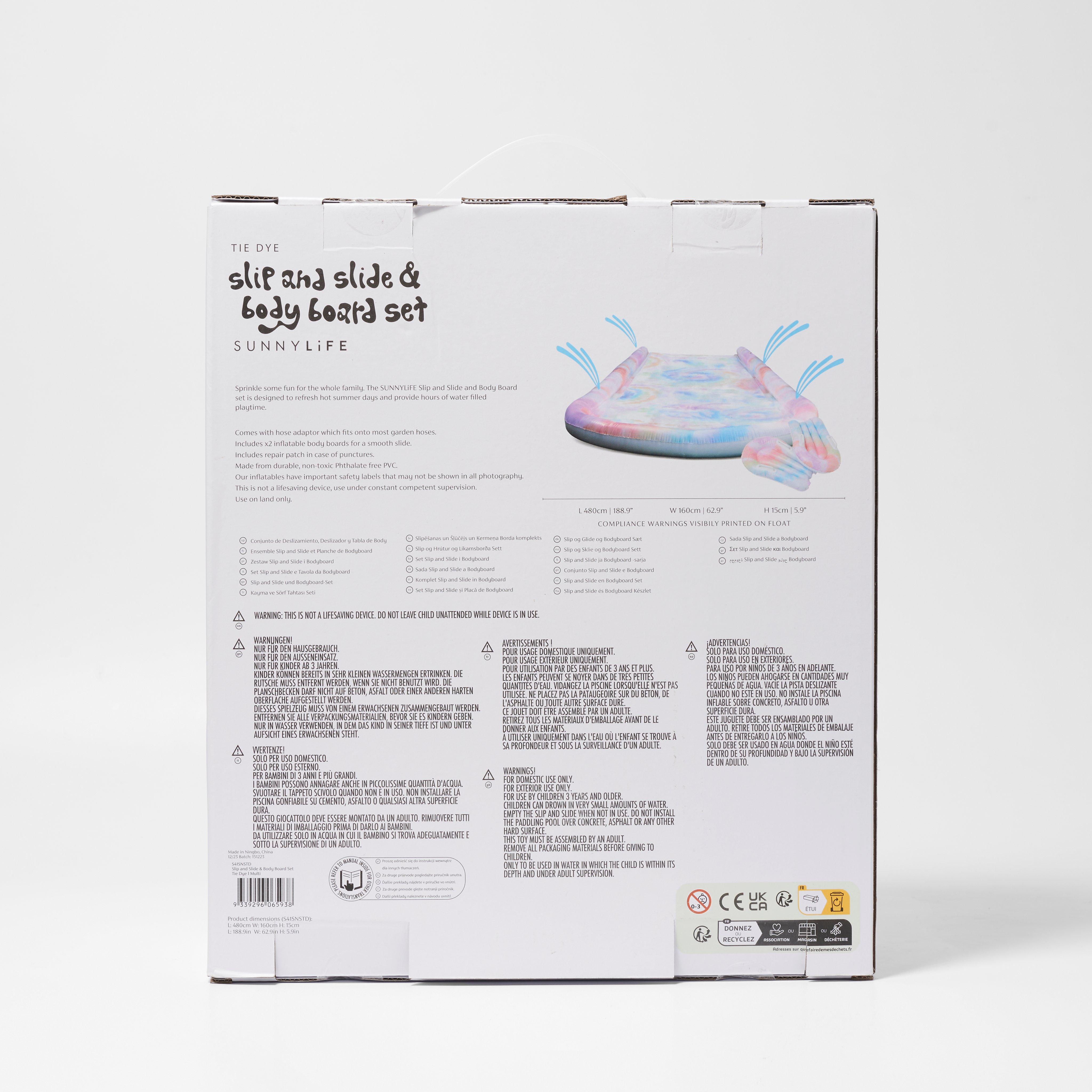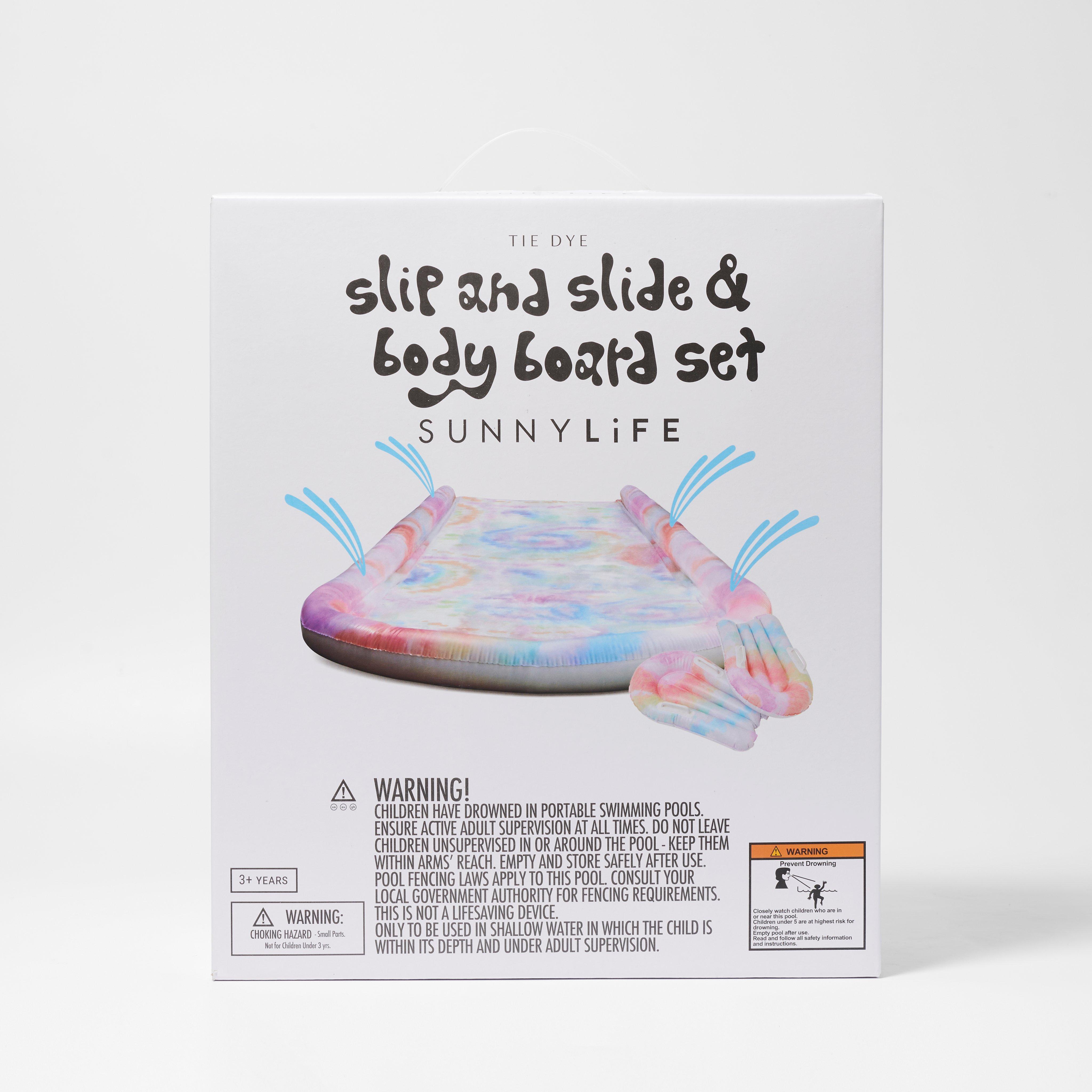 Sprinkle some fun for the whole family. Featuring a slip and slide with inflatable walls that secure into grass and 2 body boards, slipping, sliding, gliding, and riding just got even more thrilling. Simply attach to your garden hose and get soaked by the sun shower of water spraying from both sides. Everyone needs a summer backyard activity and this one will definitely turn heads with its multi coloured hues.