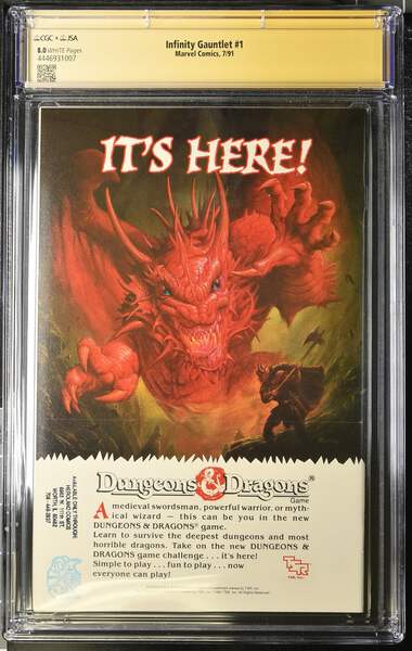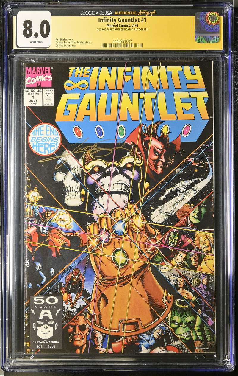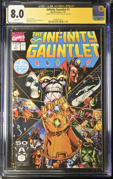 This is a certified CGC 8.0 copy of Infinity Gauntlet #1 (1991), signed by legendary artist George Perez! This key issue marks the beginning of the Infinity Gauntlet saga, a major event in the Marvel Comics universe. Having it signed by the cover artist, George Perez, adds significant value and collectability.
