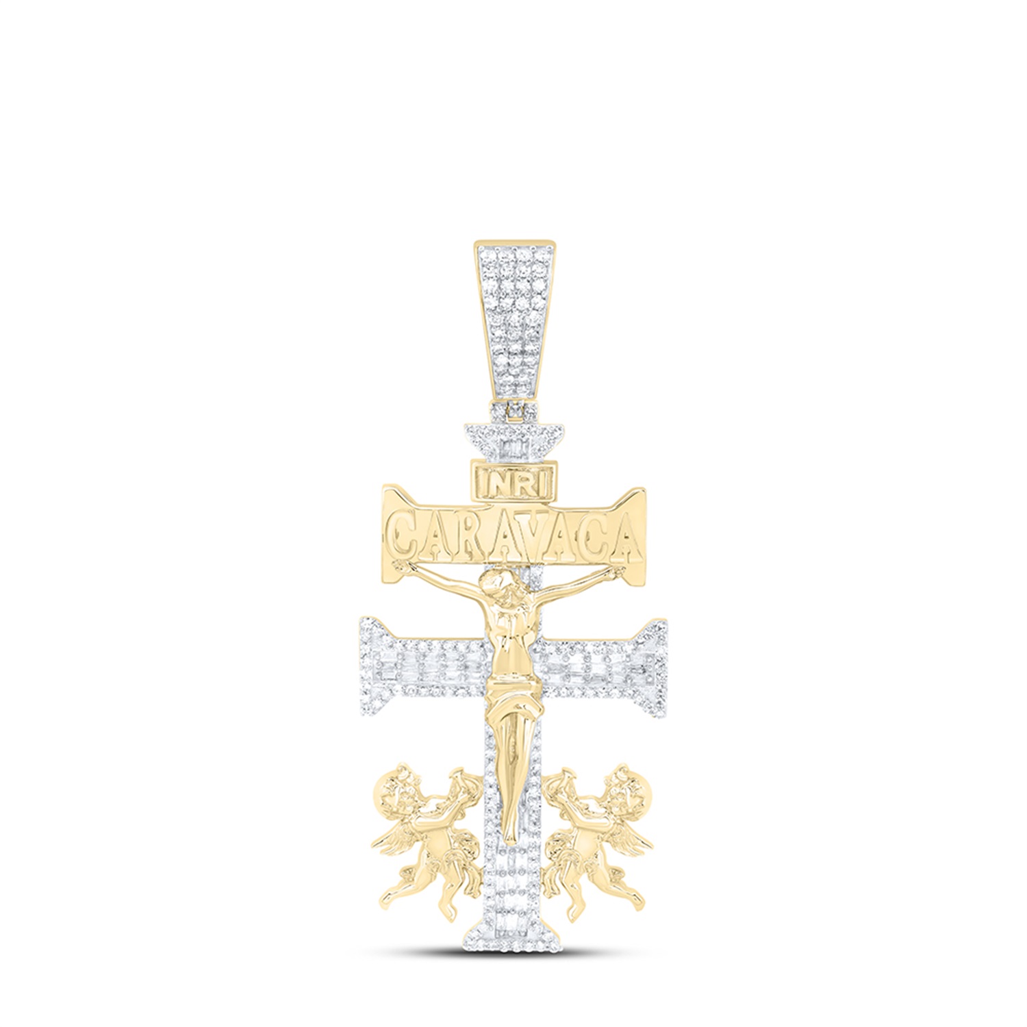 (11 gr. of 10K Yellow Gold | Total Carat Weight: 1.25 ct. t.w. of White Diamonds | Width: 1"| Clarity: I1 - I2 | Color: H - I | Earth Mined Genuine Round & Baguette Diamond Yeshua Jesus Cruz De Caravaca Plata Pendant Statement Charm)