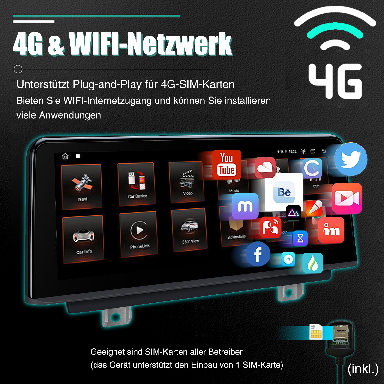 - Built-in 4G und WIFI-Modul für Internet, legen Sie einfach Ihre 4G-SIM-Karte, egal wo Sie fahren, werden Sie den Spaß von Internet-Surfen genießen, machen es möglich, für Online-Navigation / Musik / Film ect.