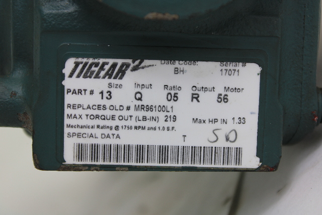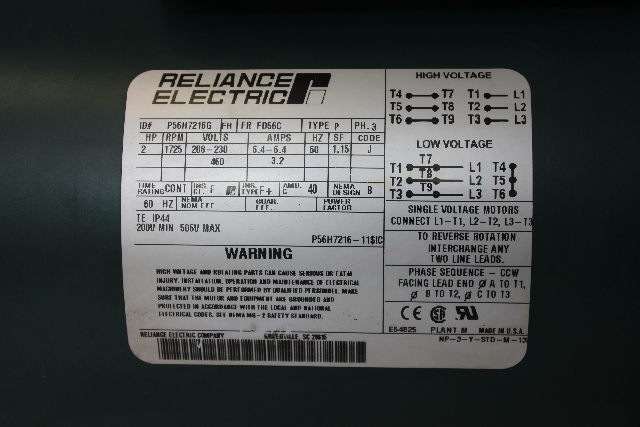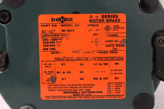 Reliance P56H7216G Electric Motor 2HP, 208-230/460V w/ 13Q05R56 Gear Reducer ALSO INCLUDES DODGE 031437 D-SERIES MOTOR BRAKE: -Torque Rating: 10 LB-FT -Frame: 56 -Voltage Rating: 230/460 VAC at 60Hz -Bore Size: 0.625 Inch -Outside Diameter: 6.63 In. RELIANCE ELECTRIC P56H7216G MOTOR: -FR: FD56C -Type: P -3-Phase -2 HP -1725 RPM -208-230/460 Volts -6.4-6.4/3.2 Amps -60 Hz -1.15 SF -Code J -Time Rating: Cont. -Ins. Class: F -Ins. Type: F+ -Ambient Temp: 40°C -NEMA Design: B -TE -IP44 -200V Min -506V Max -Reversible MADE IN USA DODGE TIGEAR2 13Q05R56 WORM GEAR REDUCER: -Max. Torque Out (LB-IN): 219 -Max. HP IN: 1.33 -Mechanical Rating @ 1750 RPM and 1.0 SF