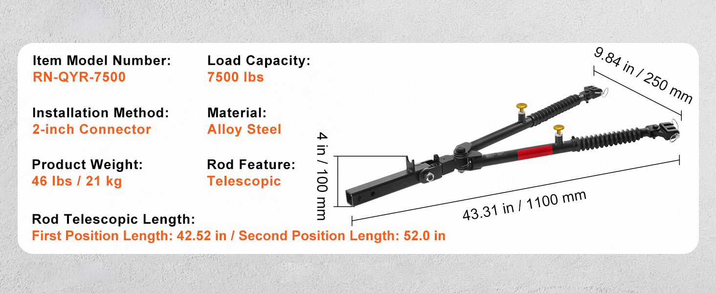 7500 lbs Towing Capacity: Get ready for some serious towing. Whether you're on a wild adventure or at a bustling work site, our tow bar pulls its weight (and then some)! With a powerful 7500 lbs towing capacity, it can handle heavy-duty vehicles with a breeze.