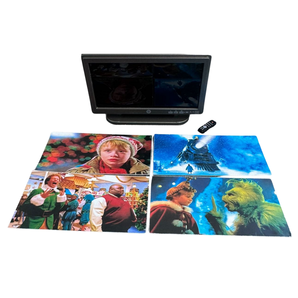 TV and remote control with an option of 4 Christmas themed film clips to enhance your miniature viewing.