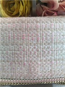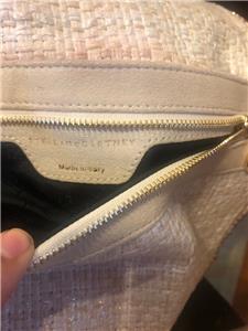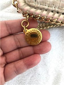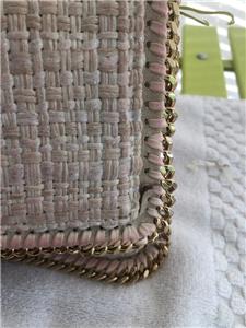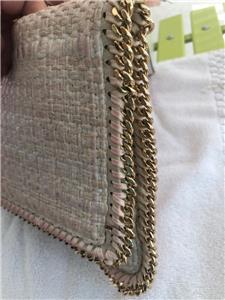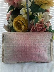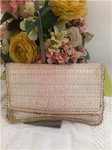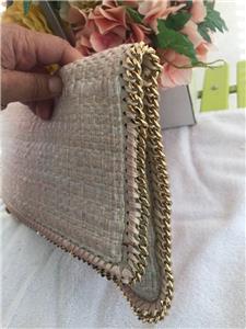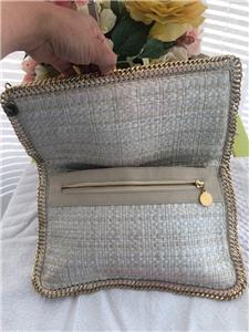 This stylish clutch is crafted of fine shimmery woven vegan materials. The bag is bordered with gold chain links . The fold over flap has a top opening to a fabric interior. This is a marvelous clutch for day or evening use, from Stella McCartney!