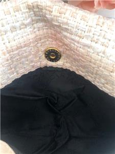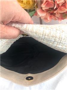 BAG IS IN GOOD USED, SOME LIGHT WEAR ON THE WOEN PART, ONE LOOSE STITCH ON LEFT LIDE OF CLUTCH, INTEIROR IS IN GOOD CONDITION. (SEE 9TH PHOTO)