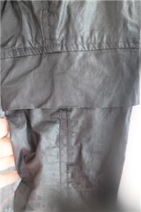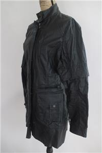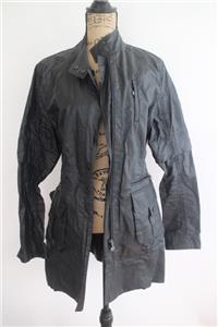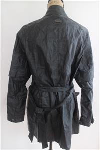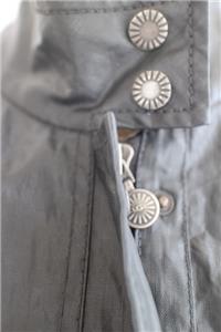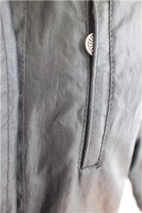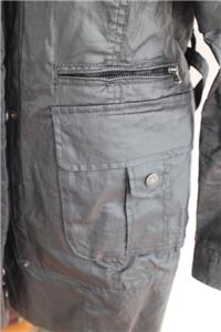 Coated linen coat, zipper front with secure snap buttons. Zipper pocket on front, zipper pocket at chest. Belted at waist. Sleeve can be zip off to wear as short sleeve.