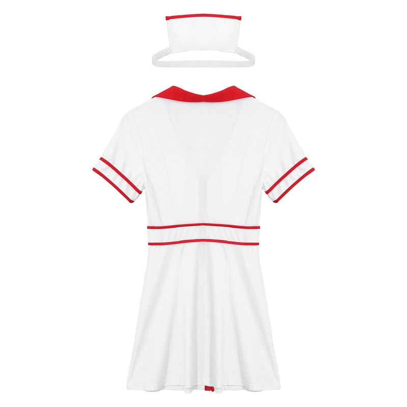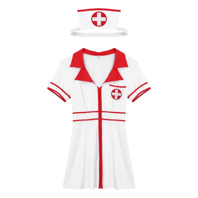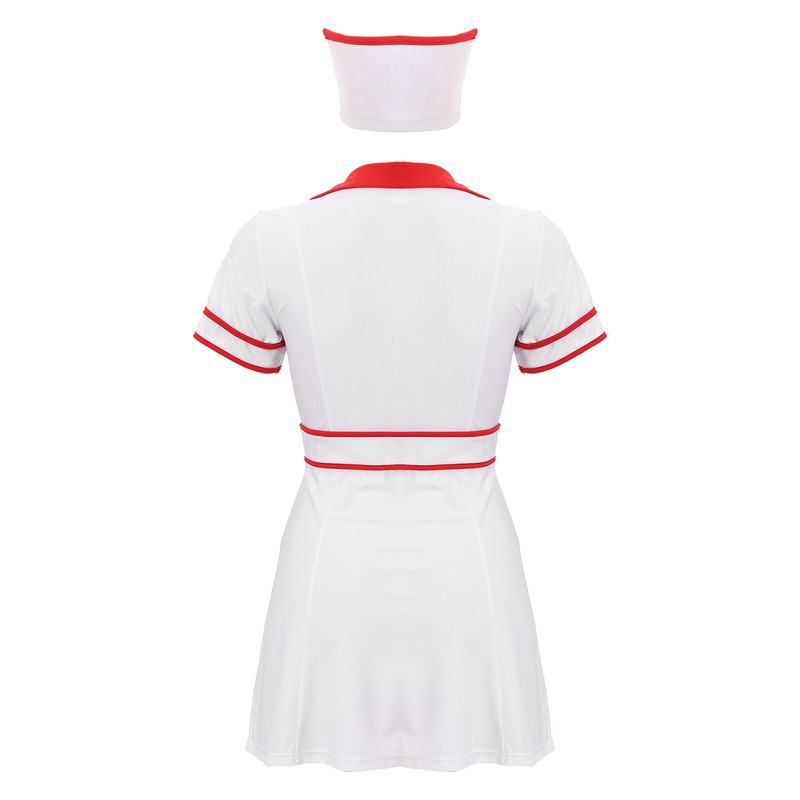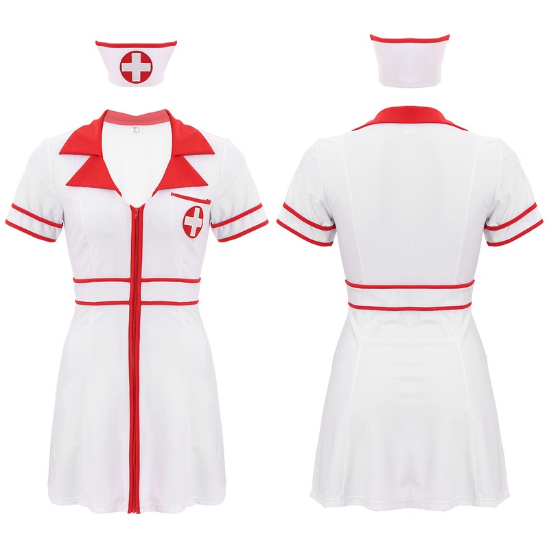 2-piece set includes a dress and a nurse hat. Designed with lapel v neck, front zipper, cross patches, contrast strips and A-line dress.