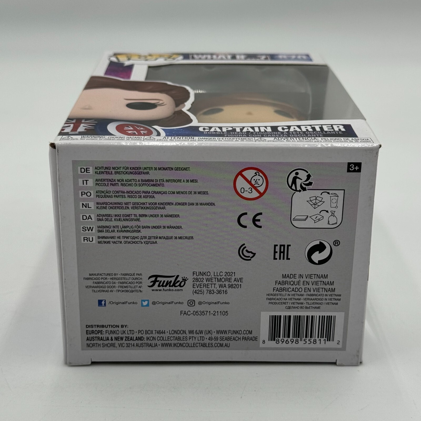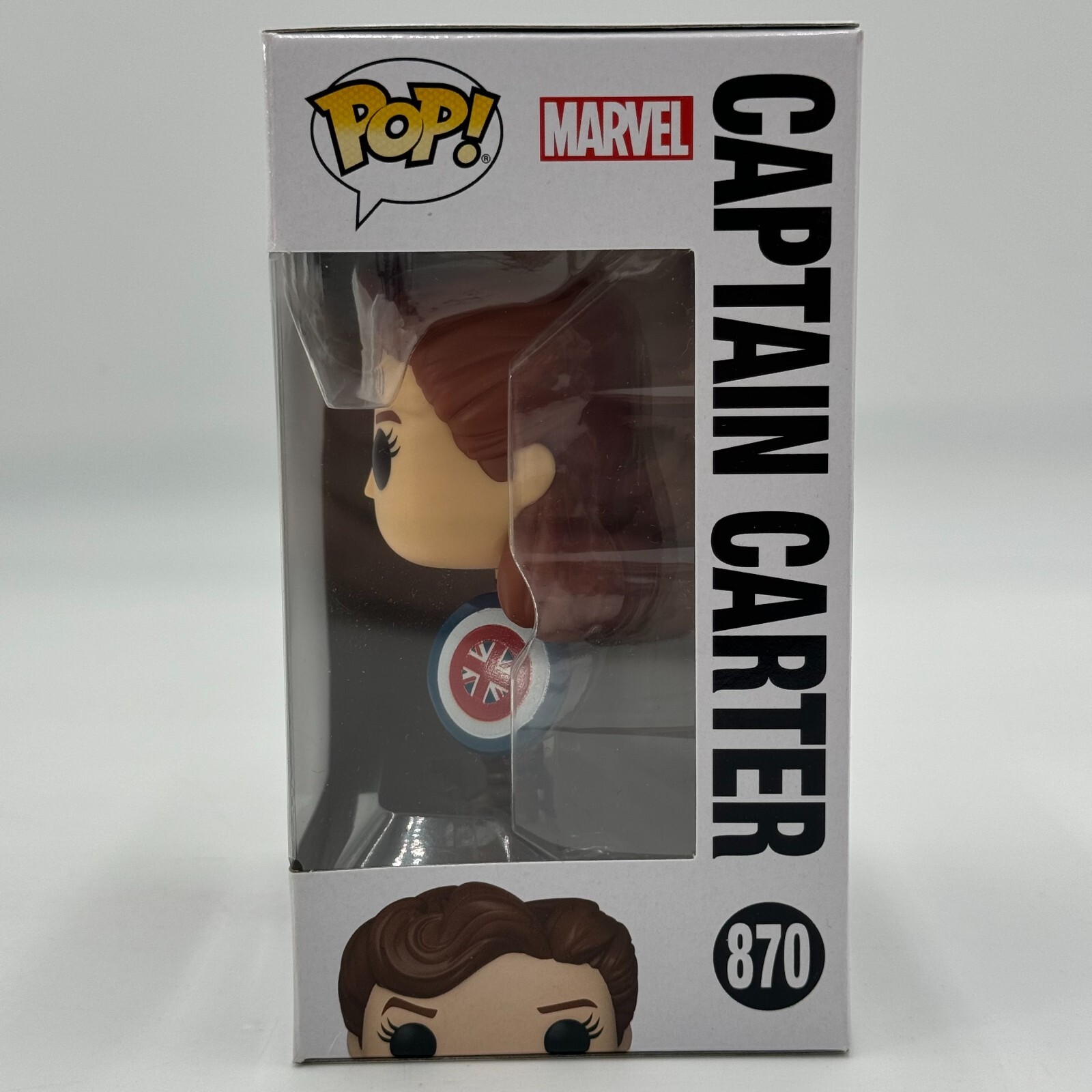 This Funko Pop figure features Captain Carter from Marvel's What If W1 series. Made of vinyl material, this collectible figure stands at approximately 3 inches tall and comes with a bobblehead accessory.