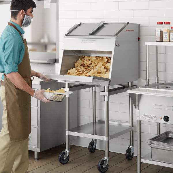 Easily upgrade nachos or chips and dip with the ServIt 26 gallon chip warmer with mobile stand! Instead of serving your signature salsa, cheese, or guacamole with room-temperature chips, serve it with warm, toasty chips for a fresh crunch. This 26 gallon chip warmer is designed for transport, as it features a portable stand with 4 casters and an adjustable undershelf. Not only is it easy to clean, it's great for food trucks, concession areas, Mexican restaurants, and other establishments with limited space where serving chips is commonplace. Doubling as a merchandiser, the unit also helps ensnare the senses by warming chips to fragrant perfection. Whether they're included in the dining experience or an add-on, the mouth-watering smell of warm chips is sure to help boost business!