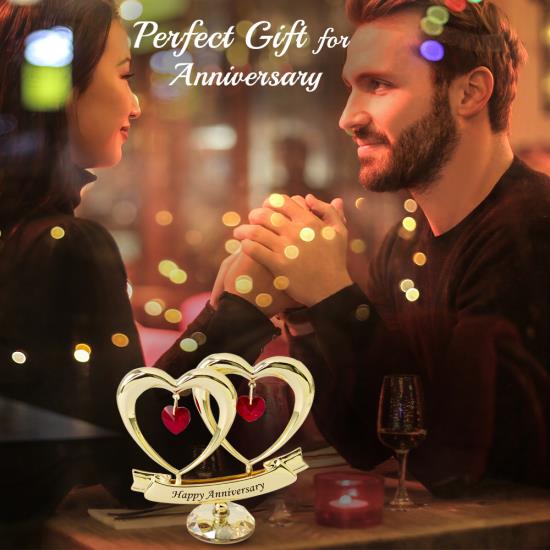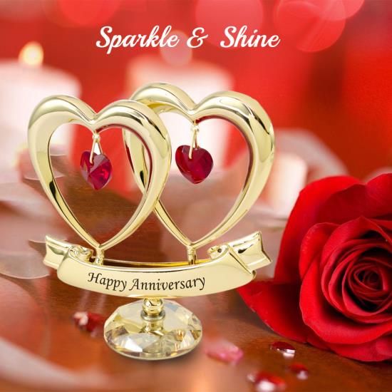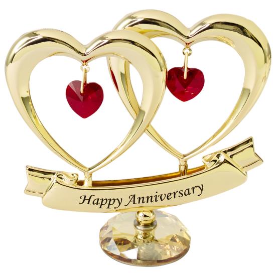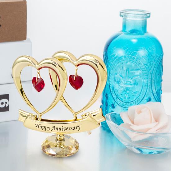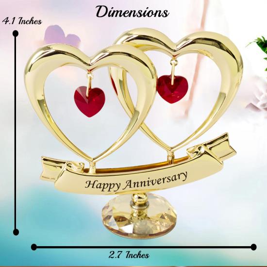 24K Gold Plated Beautiful "Happy Anniversary" Double Heart Table Top Made with Genuine Red Matashi Crystals and Crystal Base