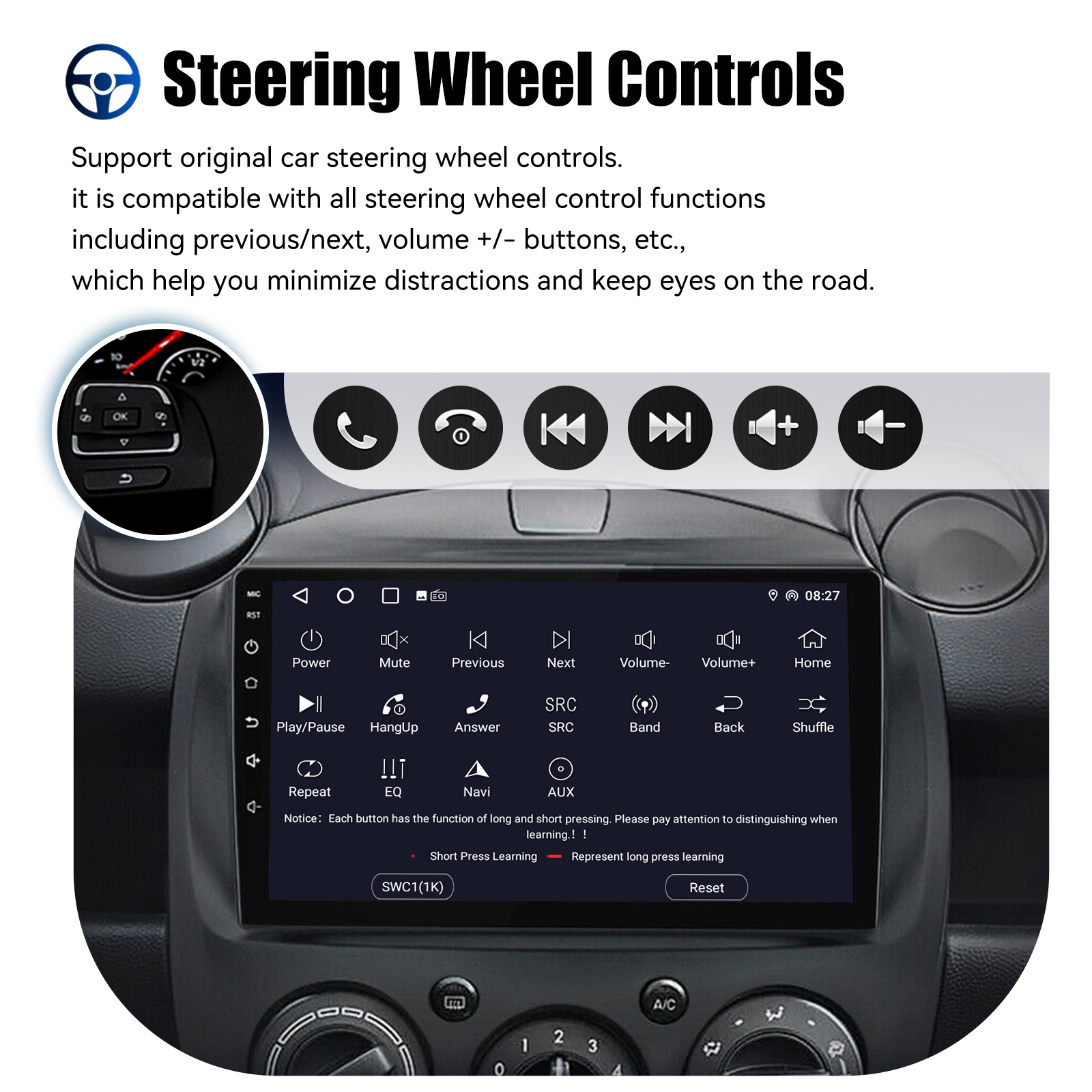 AHD Rear View Camera Input & Steering Wheel Control: After connecting to the rear view camera. The radio automatically displays the reversing image as soon as you engage reverse gear. Make your daily reversing safer. Support AHD camera. Support original car steering wheel control to make driving more convenient and safer