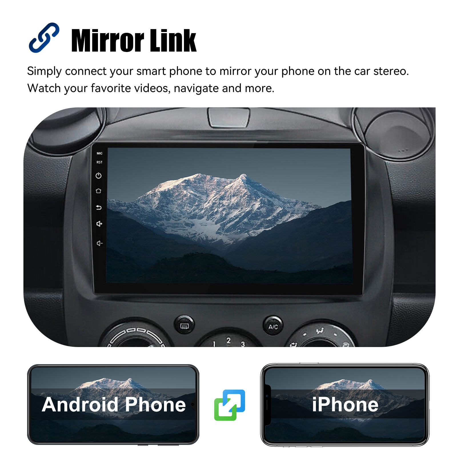 MIRROR LINK & APPLE CARPLAY & ANDROID AUTO: With this car radio, you can experience the amazing Mirror Link function, compatible with iOS and Android phones. You can mirror your smartphone screen to the car radio using apps like Google Maps, Spotify, Youtube, etc. Replace your cell phone with the car screen and turn your vehicle into a smart platform. Immerse yourself in a seamless and user-friendly infotainment experience with Apple CarPlay & Android Auto. Connect your iPhone to Apple CarPlay or your Android smartphone to Android Auto and securely access calls, texts, navigation, music and more. With intuitive operation via the touchscreen or voice control, you have all functions at your fingertips while you remain safely at the wheel. Use your favorite apps and stay connected at all times while keeping your eyes on the road. Turn your vehicle into an extended hub for your mobile devices and experience a new dimension in infotainment.