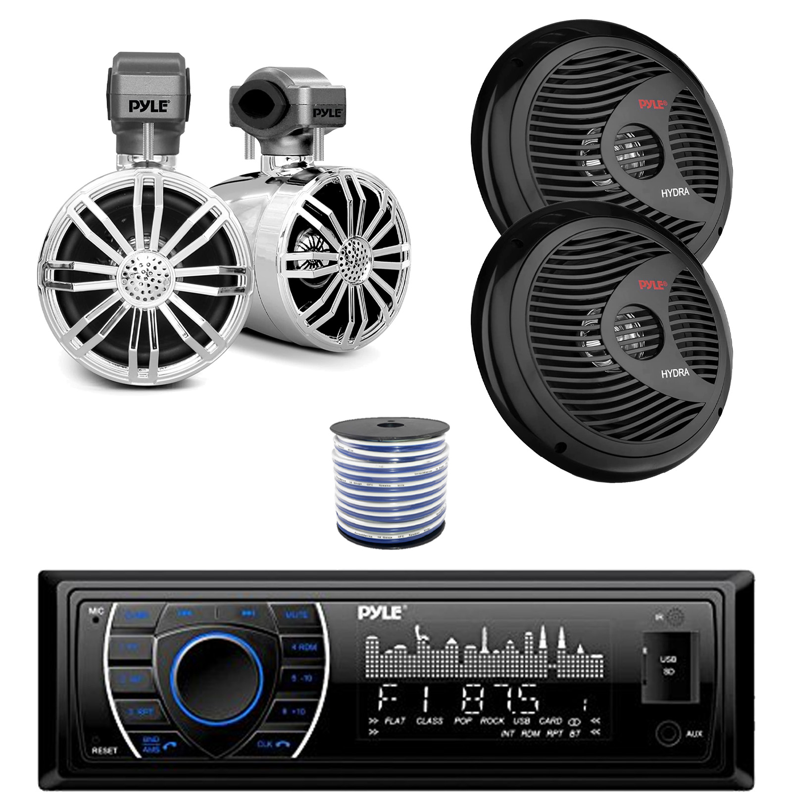 Pyle PLRMR27BTB Bluetooth MP3/USB/SD/AM/FM Radio Marine Stereo Receiver Bundle Combo One Pair (QTY 2) Of 3.5" 20W Waterproof Rated Off-Road Chrome Speakers, 2x 8" 180W Full-Range Boat Black Speakers W/Wire