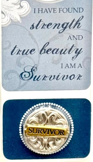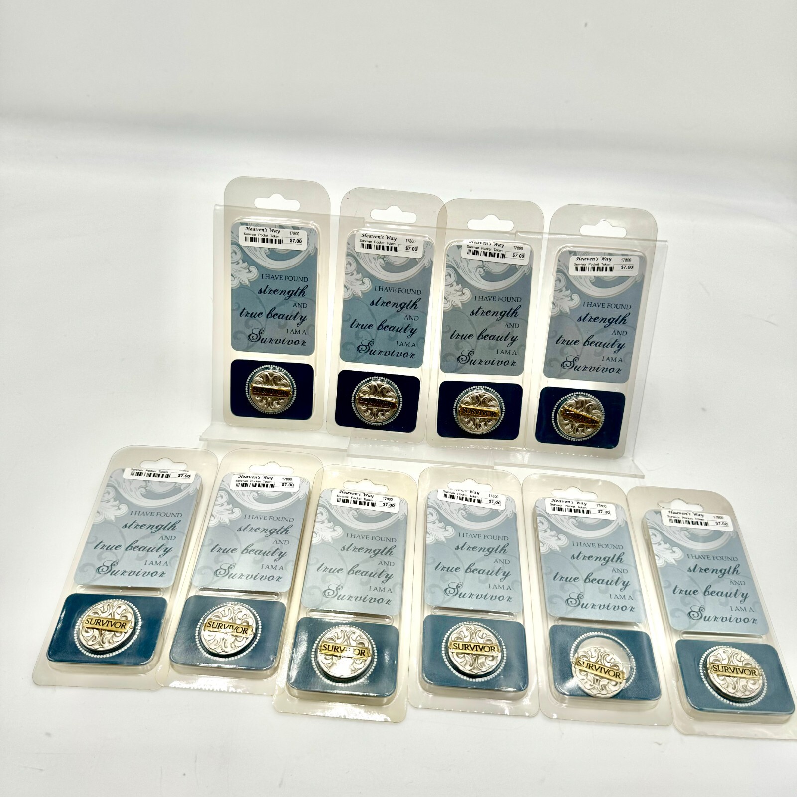 This 10 pack of Survivor Pocket Tokens features silver and gold coins with designs that showcase strength, beauty, love, and hope.