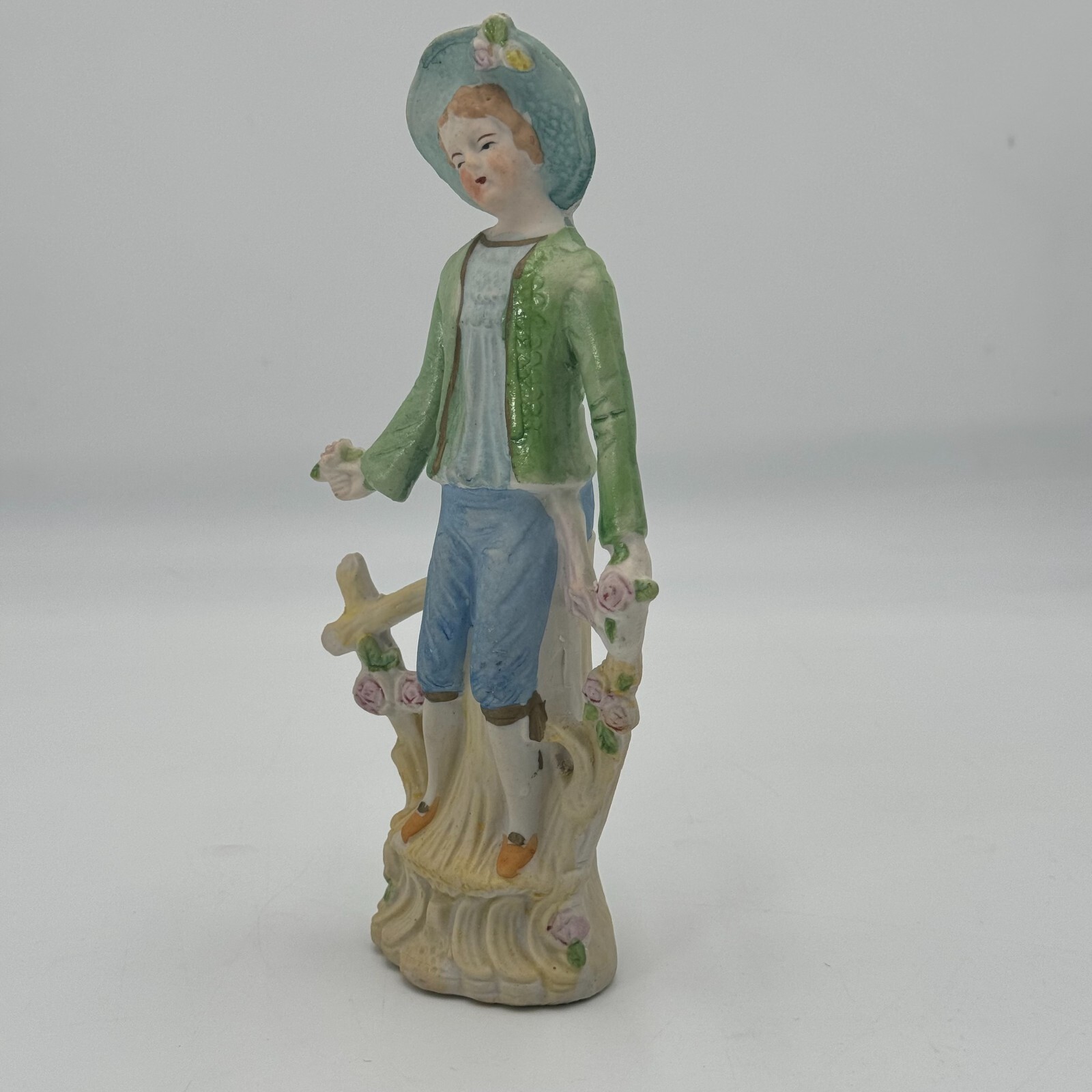 This vintage figurine from Japan depicts a young boy sitting on a fence, surrounded by roses that are hand-painted on porcelain.