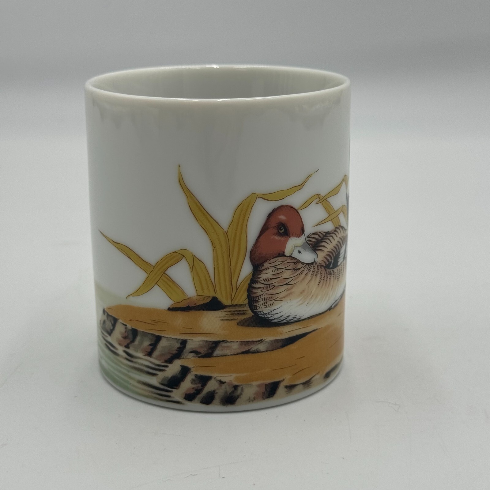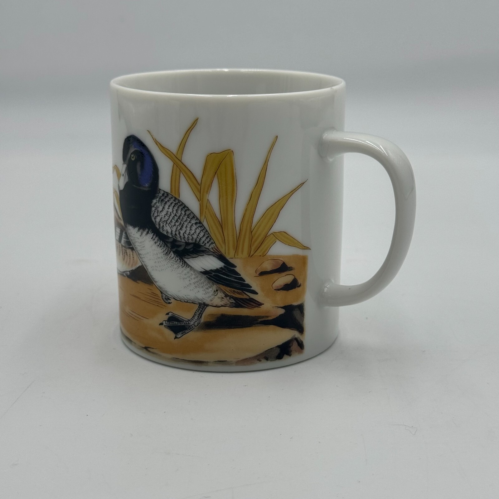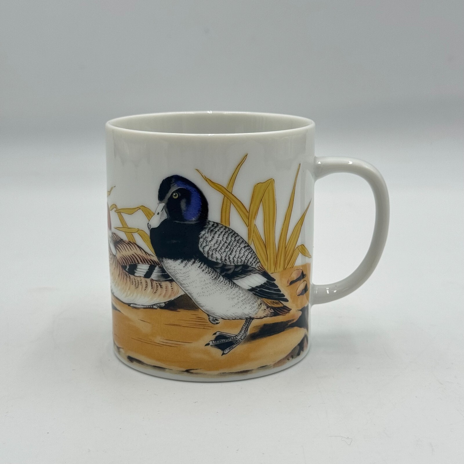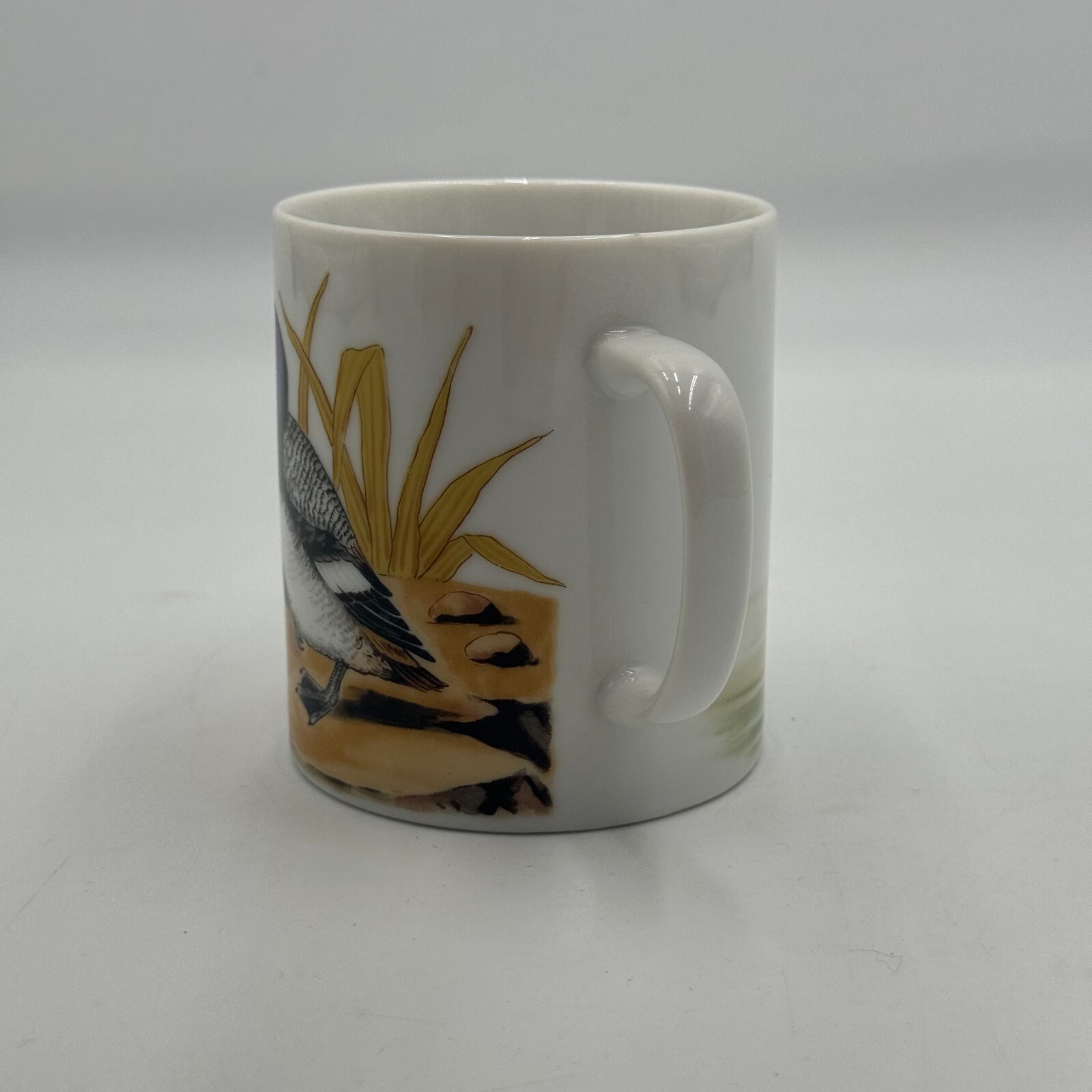 This ceramic coffee mug features a blue, green, and yellow duck design inspired by nature.