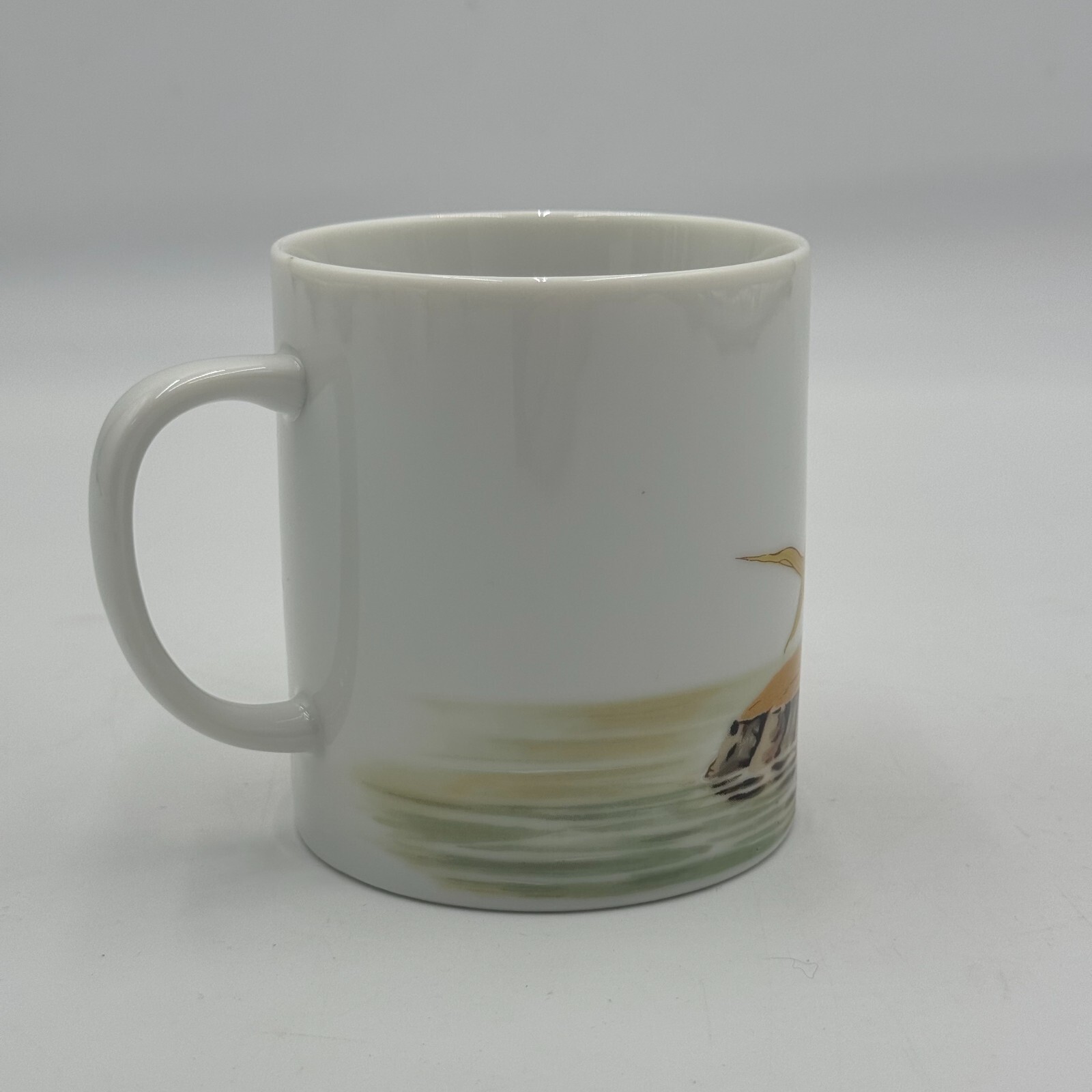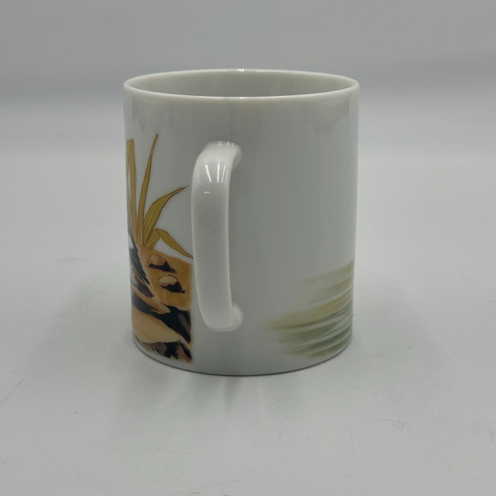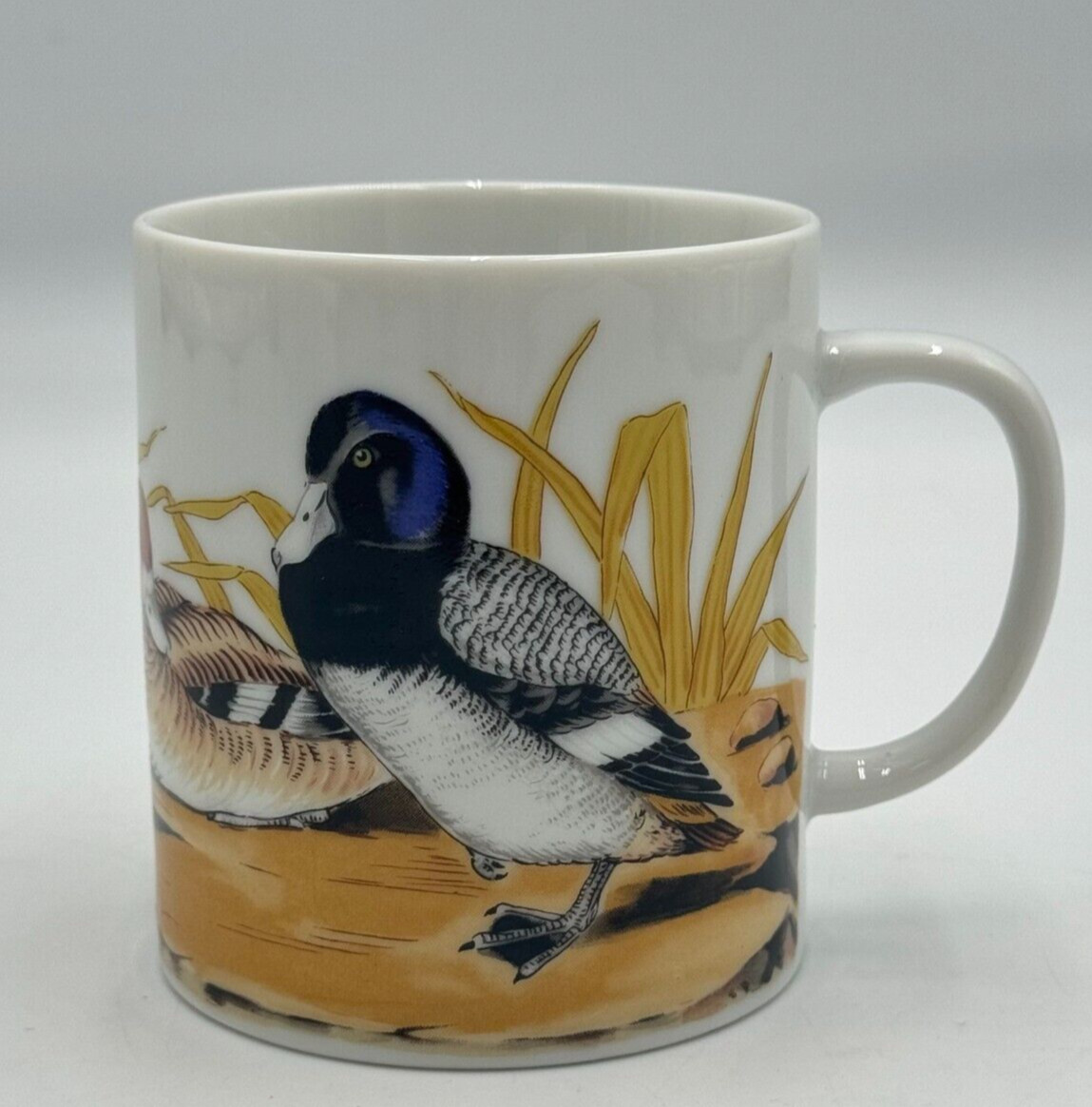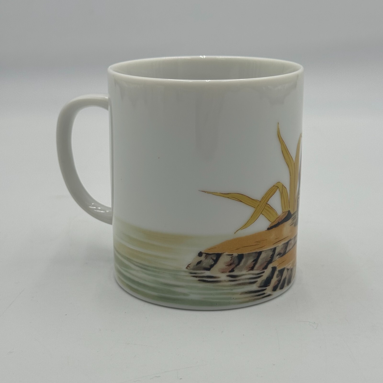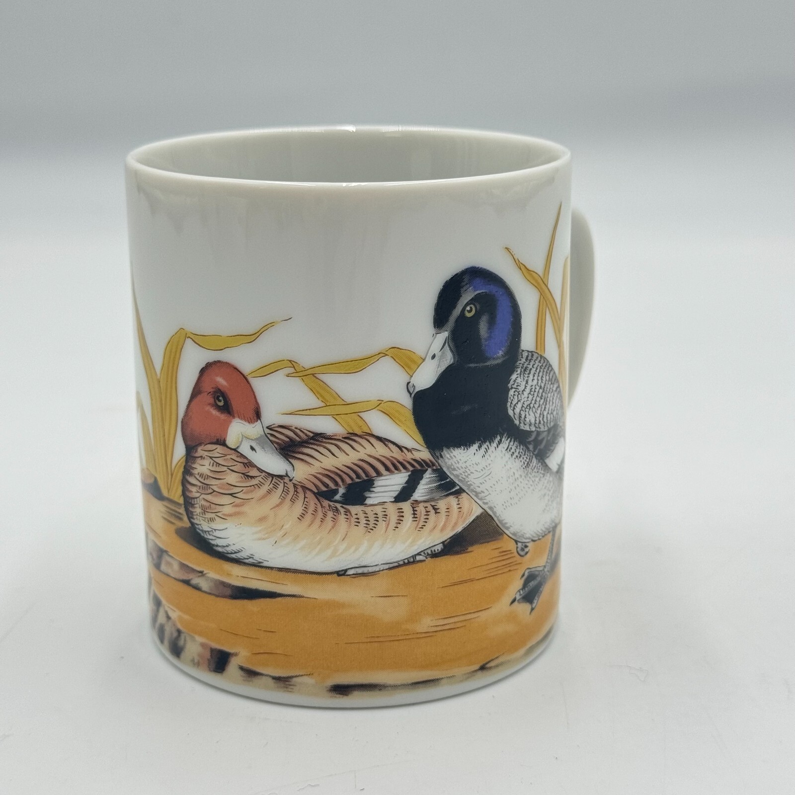 This ceramic coffee mug features a blue, green, and yellow duck design inspired by nature.