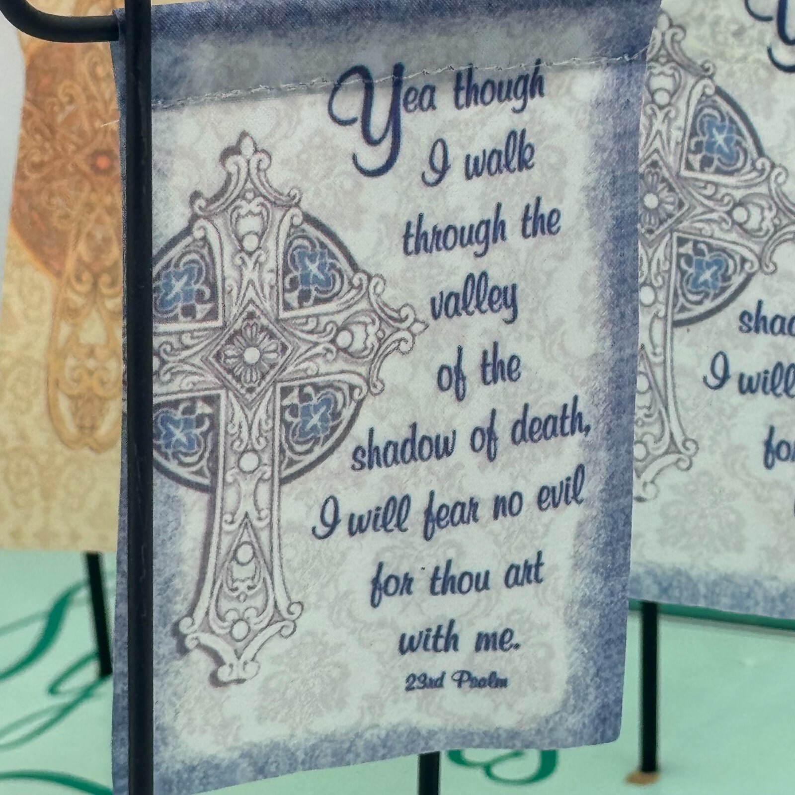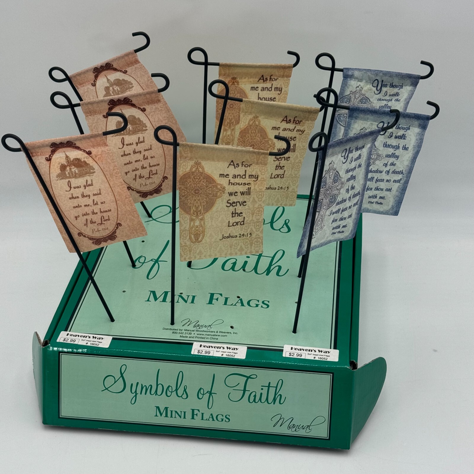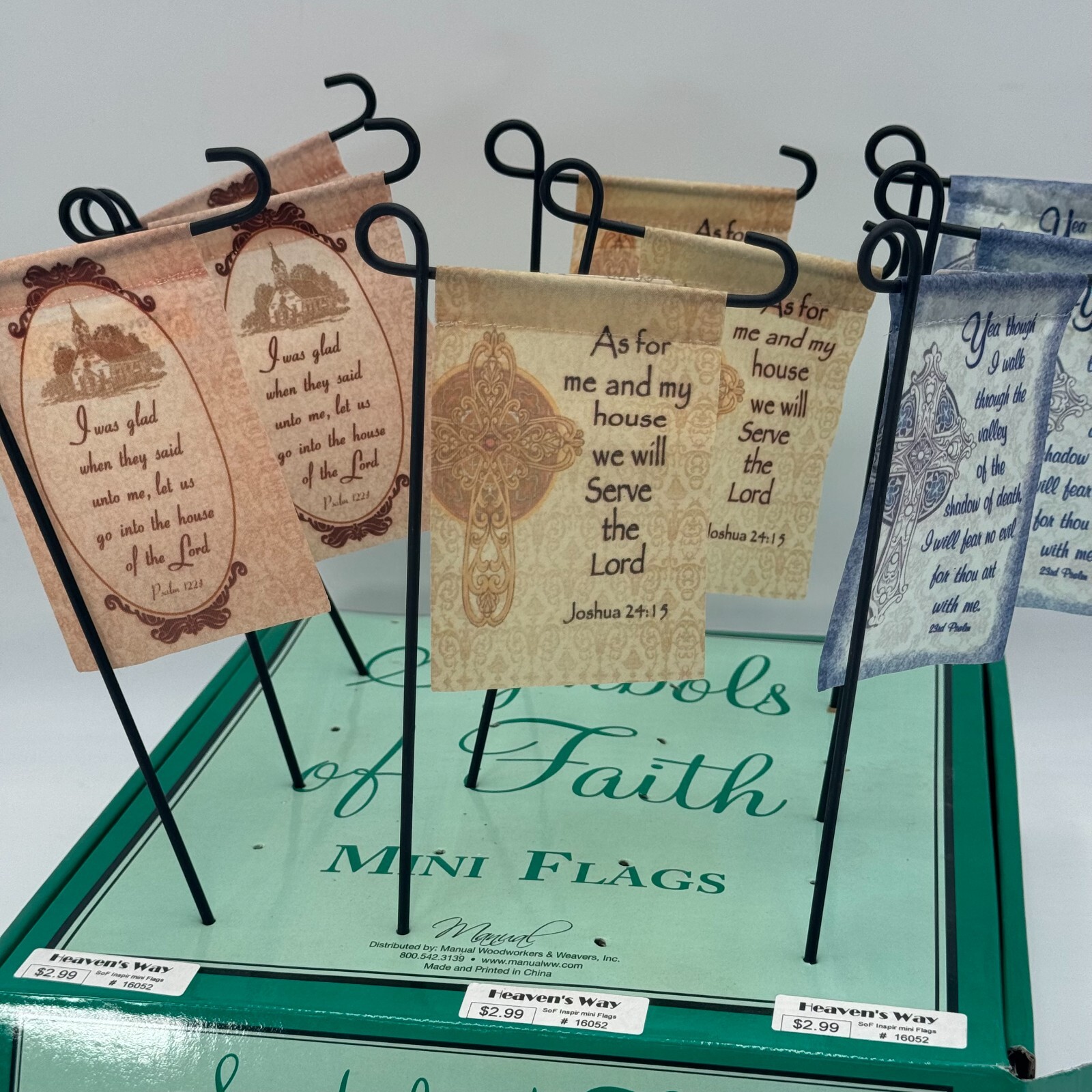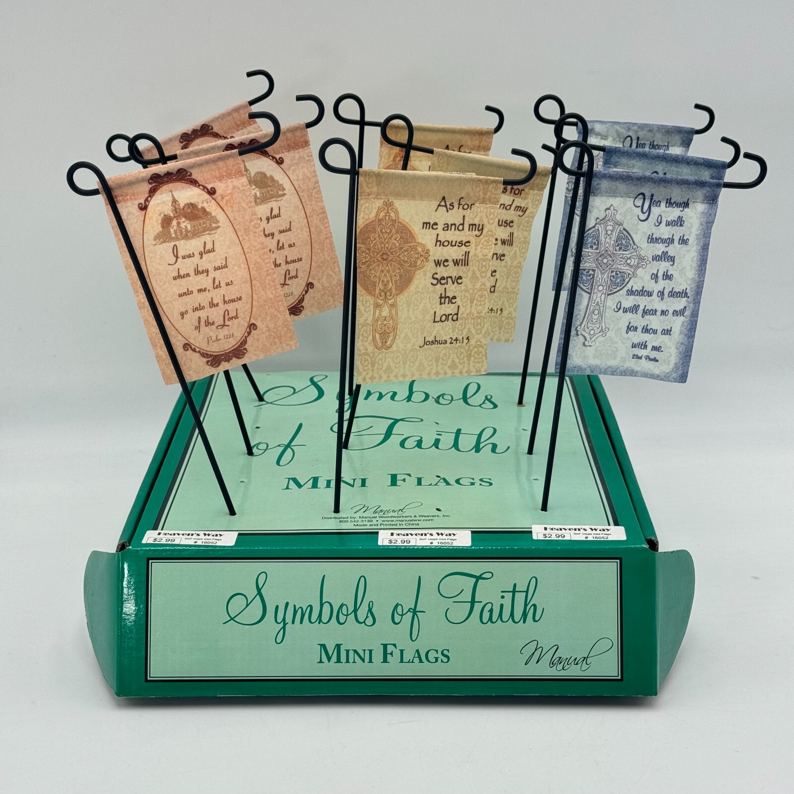 Showcase your faith with this lot of 9 Symbols of Faith mini Christian flags.
