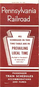 For auction is a passenger train timetable dated April 29, 1962. It contains listings for all passenger runs on the PARR. Listings are by run number, with arrival/departure times for stations served. For the major trains, equipment manifests are provided. The PARR operated such famous "named" trains as the Broadway Limited, the Manhattan Limited, the Spirit of St. Louis, the Cincinnati Limited, the General, and the Clevelander.