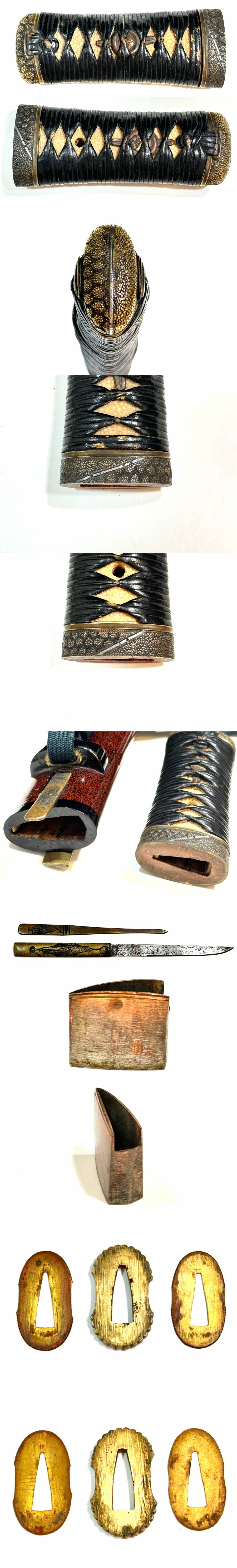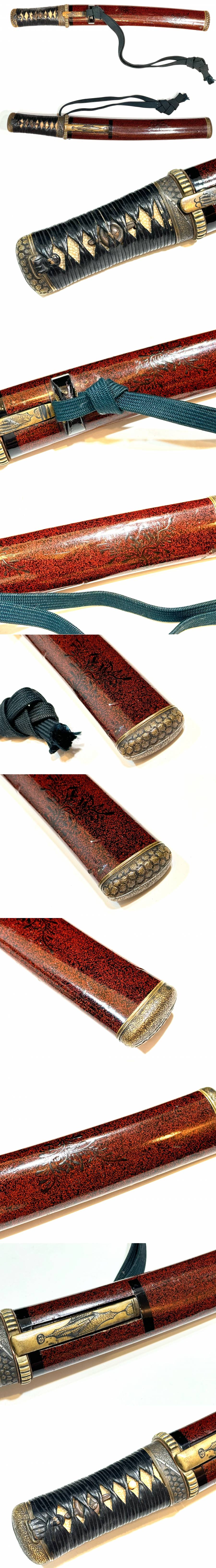 The most notable feature is the koshirae. This is Matsushiro_Koshirae, a koshirae made by the Matsushiro clan. All the metal fittings are made of brass, and the scabbard is mostly red. This koshirae has arabesques painted in lacquer, and one can imagine that it belonged to a samurai of the Matsumae domain, a prestigious clan. It is a very decorative tanto.