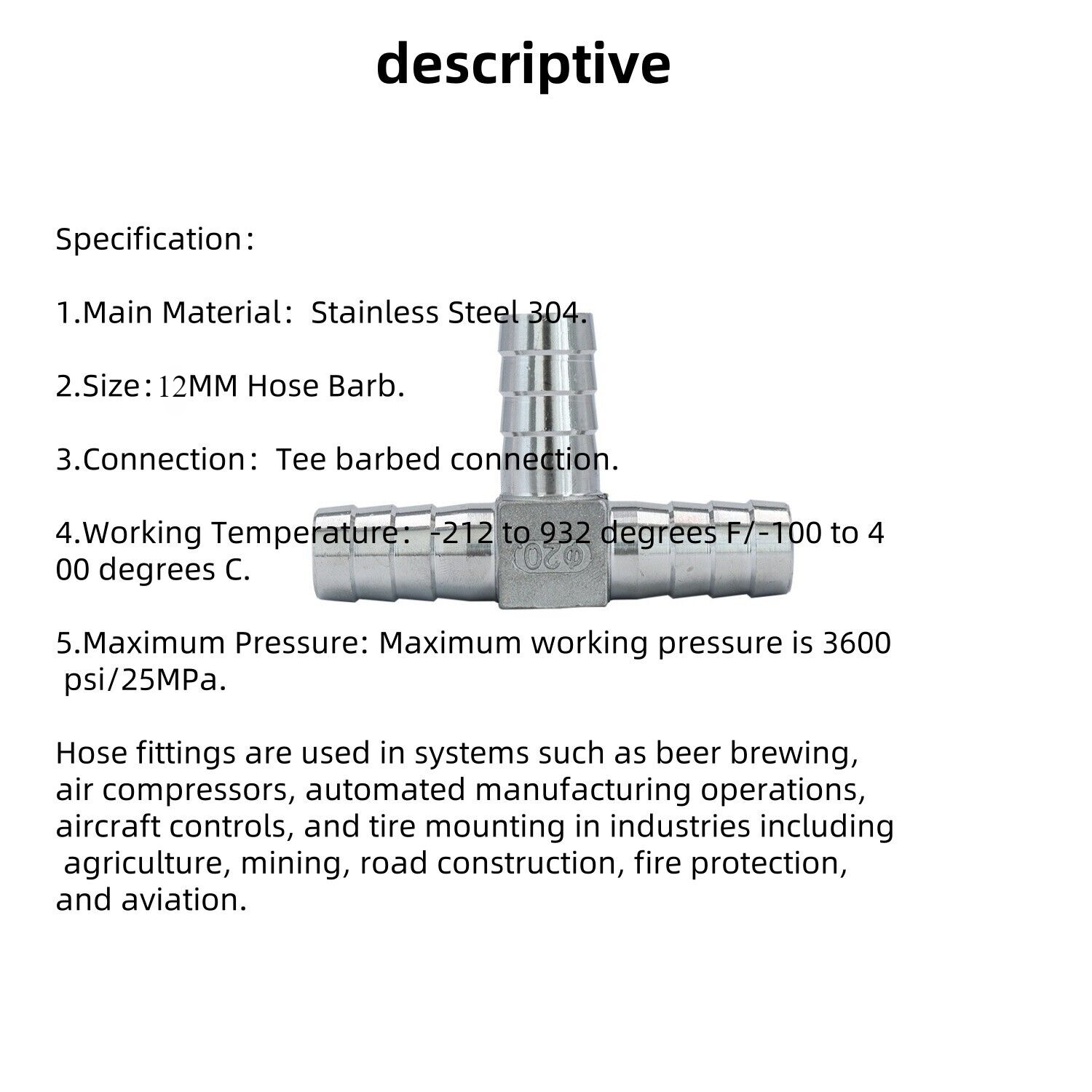 Hose fittings are used in systems such as beer brewing, air compressors, automated manufacturing operations, aircraft controls, and tire mounting in industries including agriculture, mining, road construction, fire protection, and aviation.