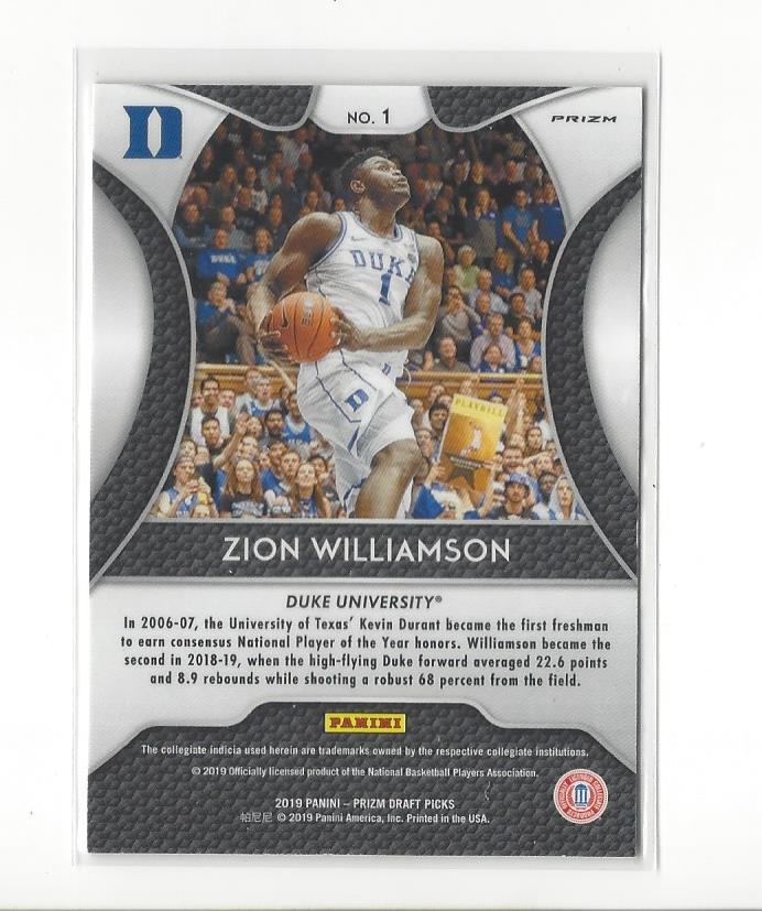 2019-20 Prizm Draft Picks Prizms Silver #1 Zion Williamson Rookie Duke Pelicans
