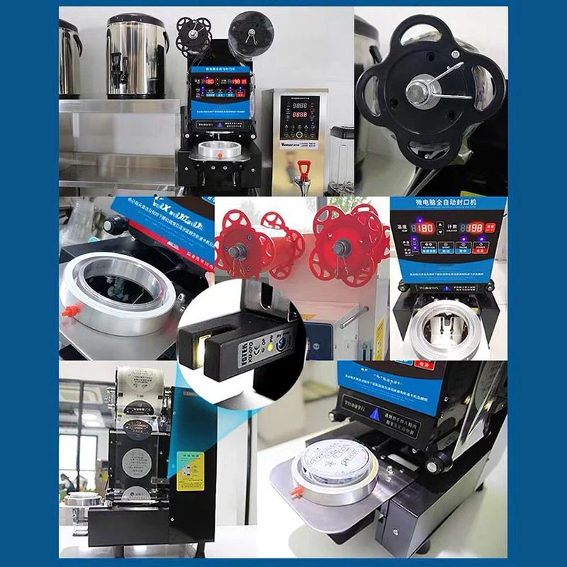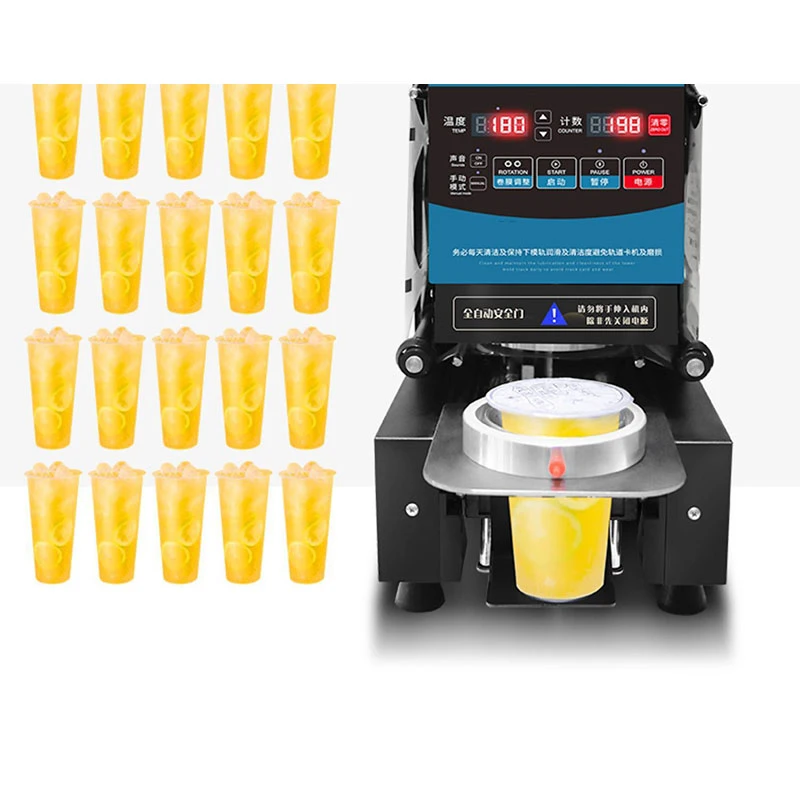Product size:250*392*530mm Voltage:220V/50HZ Power:350W Volume:34BD Sealing diameter: 90/95mm Can seal the cup high: Up to 20cm Operating capacity: 540-760 cups / hour 12 upgrade functions, high-efficiency cup splitting, durable, easy to earn more for you 1. Support temperature setting, freely adjust the required temperature, 60-230 ℃ can be set 2. English intelligent panel control, the microcomputer can be operated visually, and the operation indicator light is displayed on the panel during the whole process, the operation is simple, and the work efficiency and safety are greatly improved 3. Paper cups and plastic cups are common, and can be sealed up to 20CM 4. Induction recognition, automatic cup sealing 5. Constant temperature heating 6. Quiet operation 7. The protection device is uninterrupted 24 hours a day, no matter how many customers can be calmly dealt with, the commercial sealing machine works for a long time 8. Switchable modes, automatic and manual dual-mode switching, 9. Automatic counting, precise counting, convenient statistics, 540-760 cups/hour 10. The cup sealing prompt sound. Quickly seal the cup, and remind the milk tea to complete when the clerk is busy, so as not to delay the customer or the continuous work 11. The cup can be sealed twice 12. Roll film adjustment The importance of the right temperature The suitable temperature can help our machine to seal the film better, and it can also make the drink cups easy to reach the state of watertightness. PE cup 175℃ PP cup 180-190℃ PS cup 170-180℃Paper cup 120-180℃ Easy tear film 120-180℃ Aluminum foil film 140-180℃