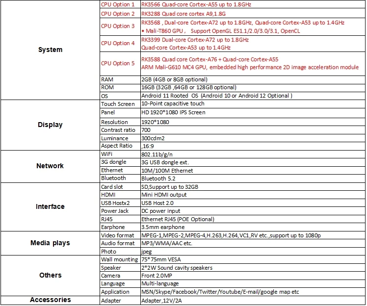 USB Host x 3, Mini USB OTG, DC power jack, SD card slot, RJ45, 3.5mm earphone