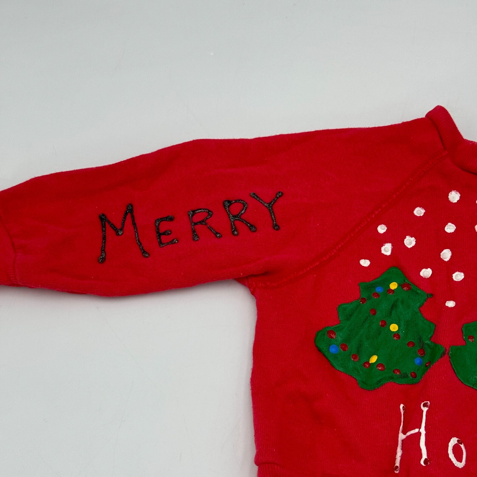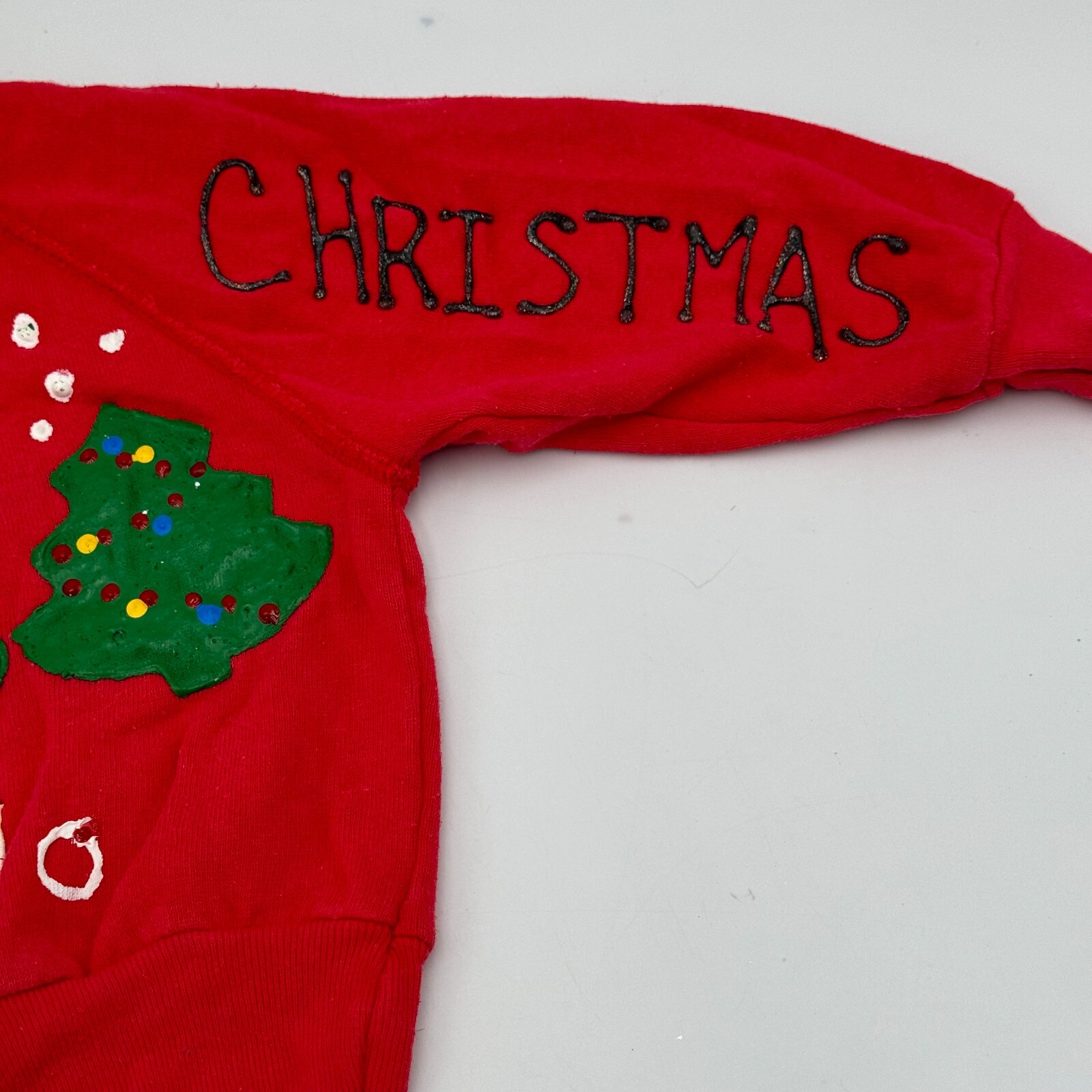 Get your little one in the holiday spirit with this adorable Christmas sweater featuring a festive design of red snow trees, Santa, and reindeer.