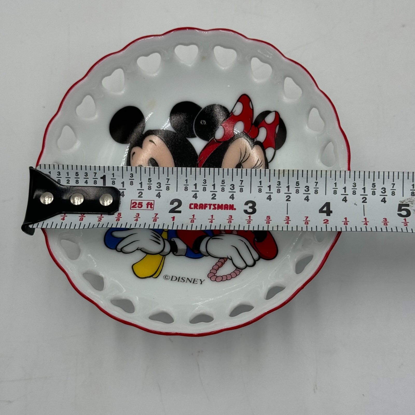 The trivet is a part of the Disney Mickey Mouse Spoon Trivet Minnie Reutter Heart Bowl collection. It is an ideal addition to any Disneyana collection and is sure to delight any fan of the franchise. Use it to hold hot dishes or as a decorative piece in your home.