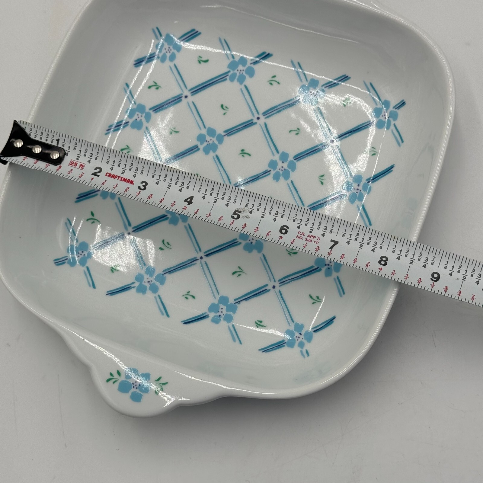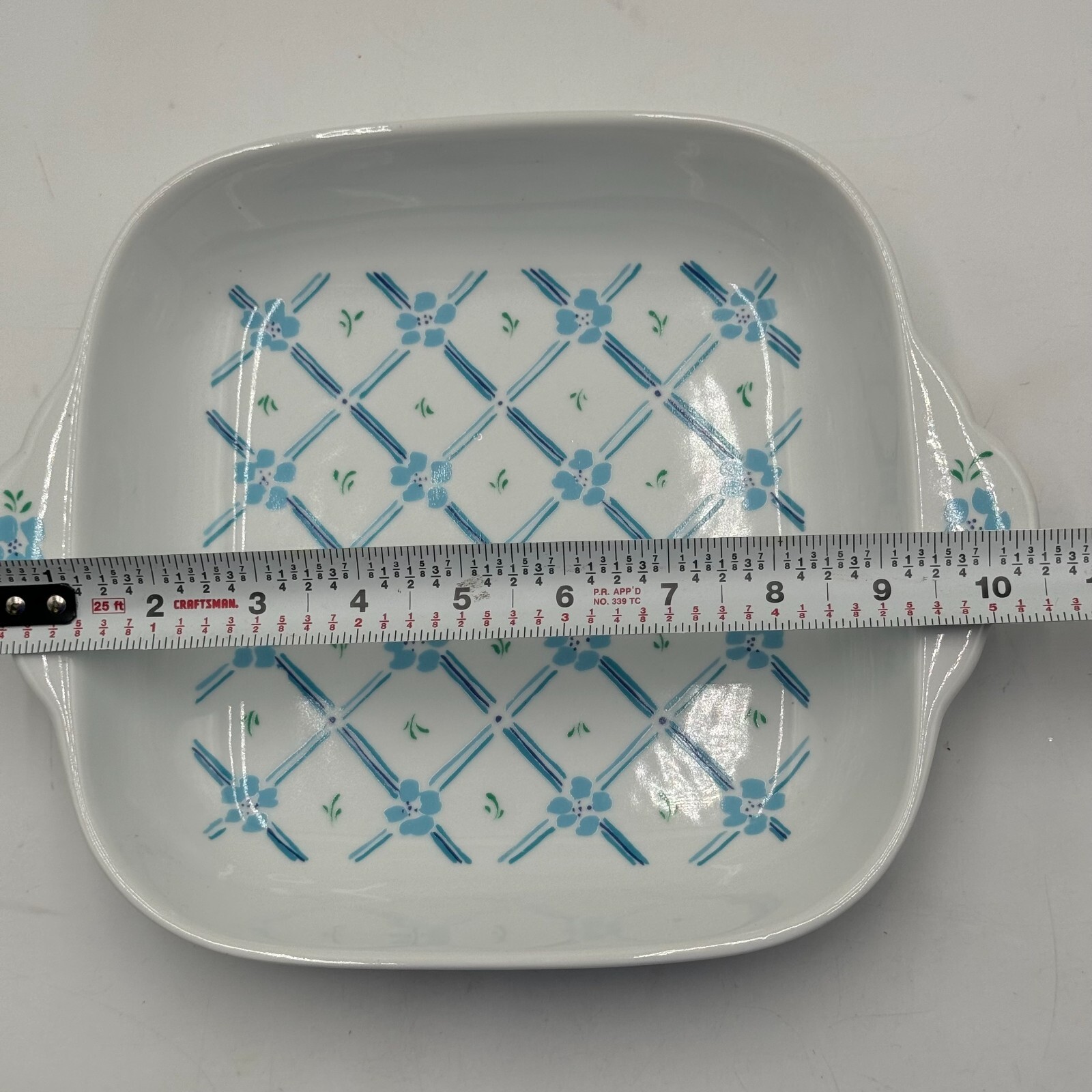The set includes a 7-inch soup bowl, a lid, a serving platter, and a pan, all in a beautiful blue floral pattern.
