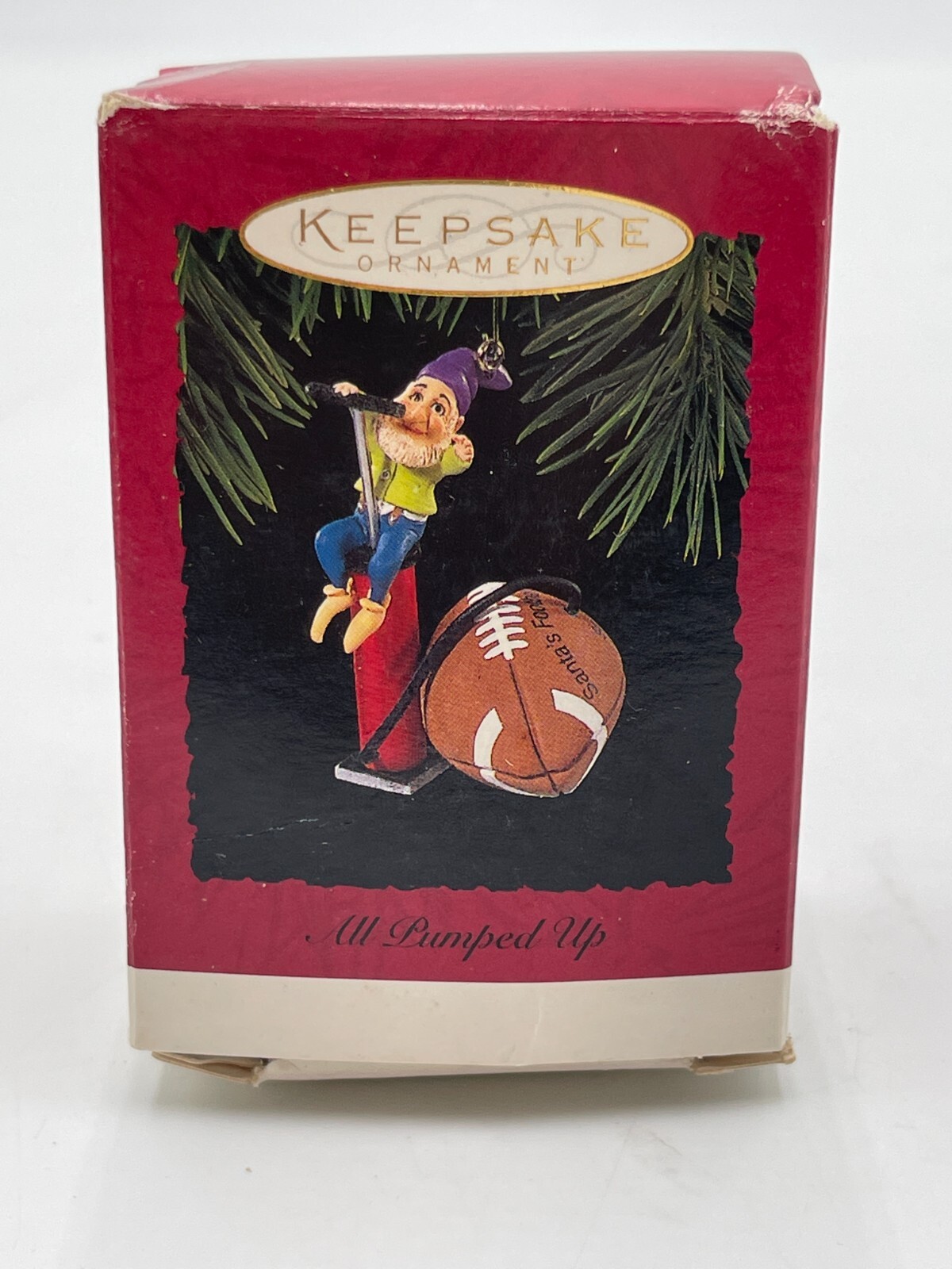 This Hallmark Keepsake Christmas Ornament from 1994 features a fun and unique design - an All Pumped Up Football Elf!