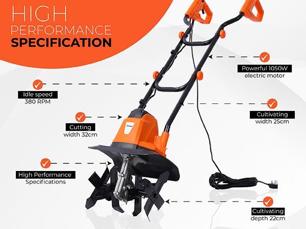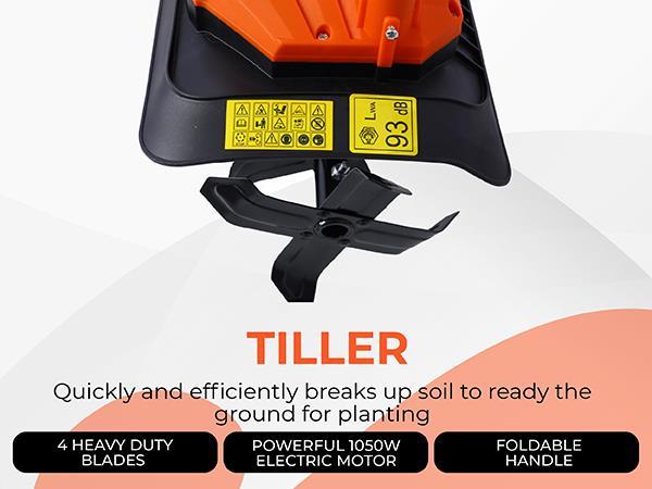 Powerful 1050W Motor – easily tills and cultivates compacted soil.