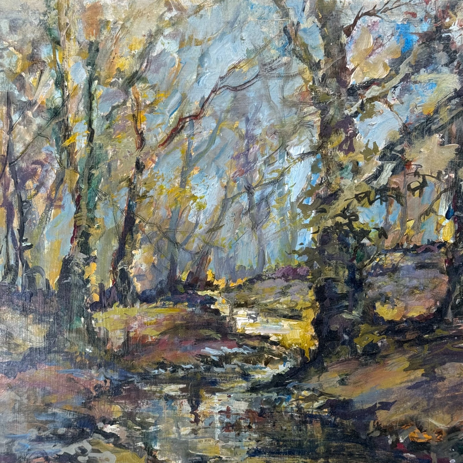 This stunning 18x22 oil painting by Yram Allets is a one-of-a-kind piece that captures the beauty of autumn with its vibrant colors and crisp air. The painting features a creek that flows through a forest landscape, depicting the interconnectedness of nature. The contemporary realism and impressionism style of the painting is sure to captivate any art lover.