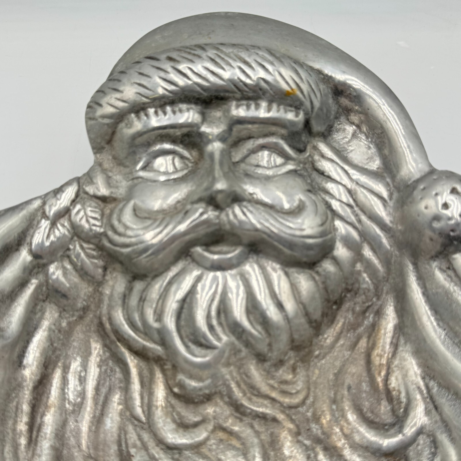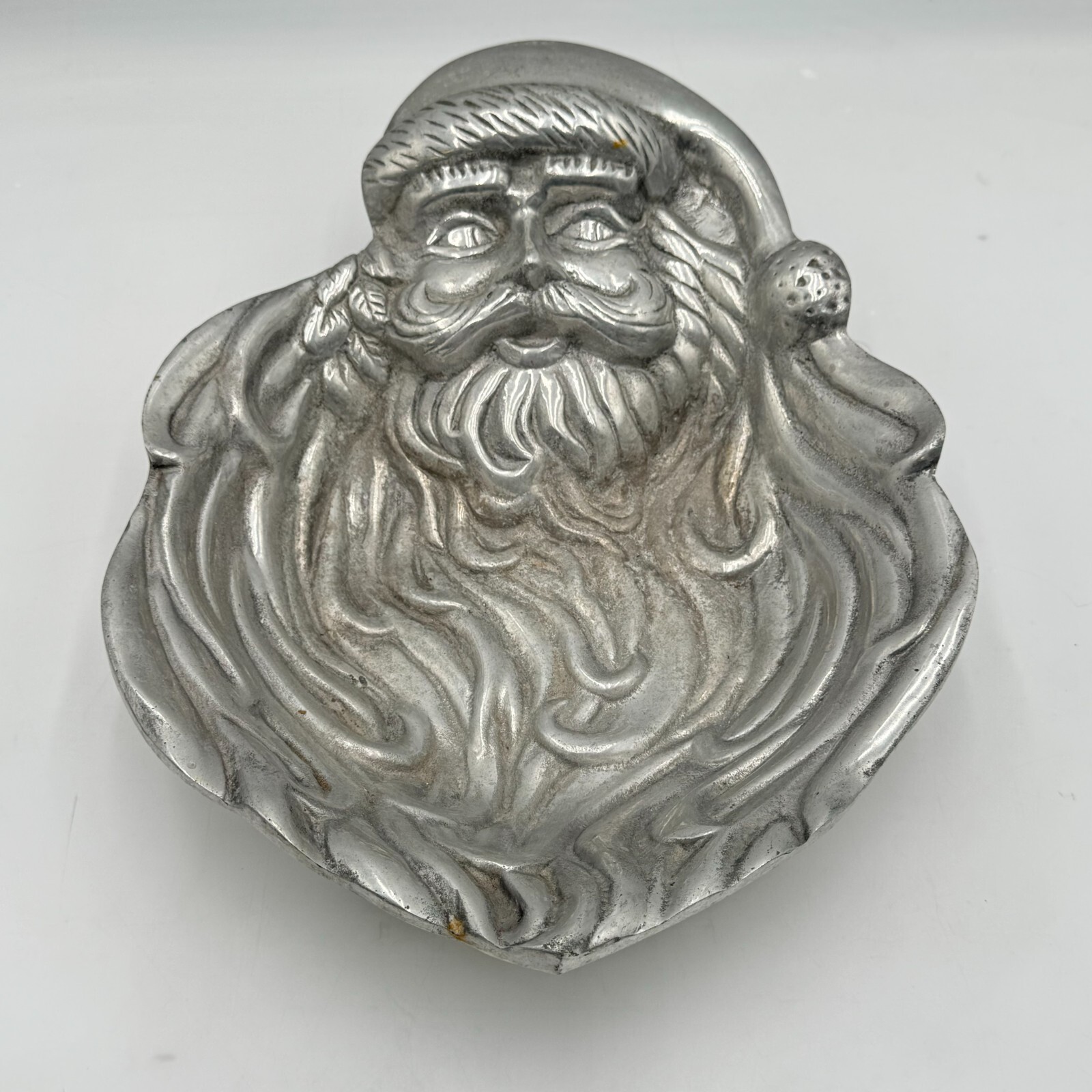 This vintage Santa Claus dish is the perfect addition to your holiday table décor. Crafted from detailed metal, this large 15" dish features an all-over silver color with a metallic finish. The intricate design of Santa's face adds a touch of seasonal charm to your Christmas dinner party.