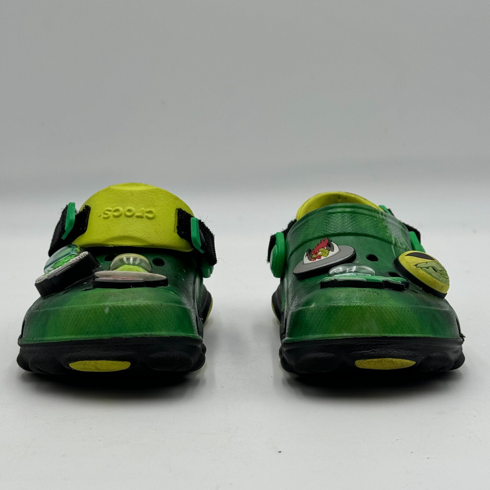 Elevate your casual shoe game with these rare CROCS X Ron English Area 54 All Terrain Glow Green Alien UFO sneakers.