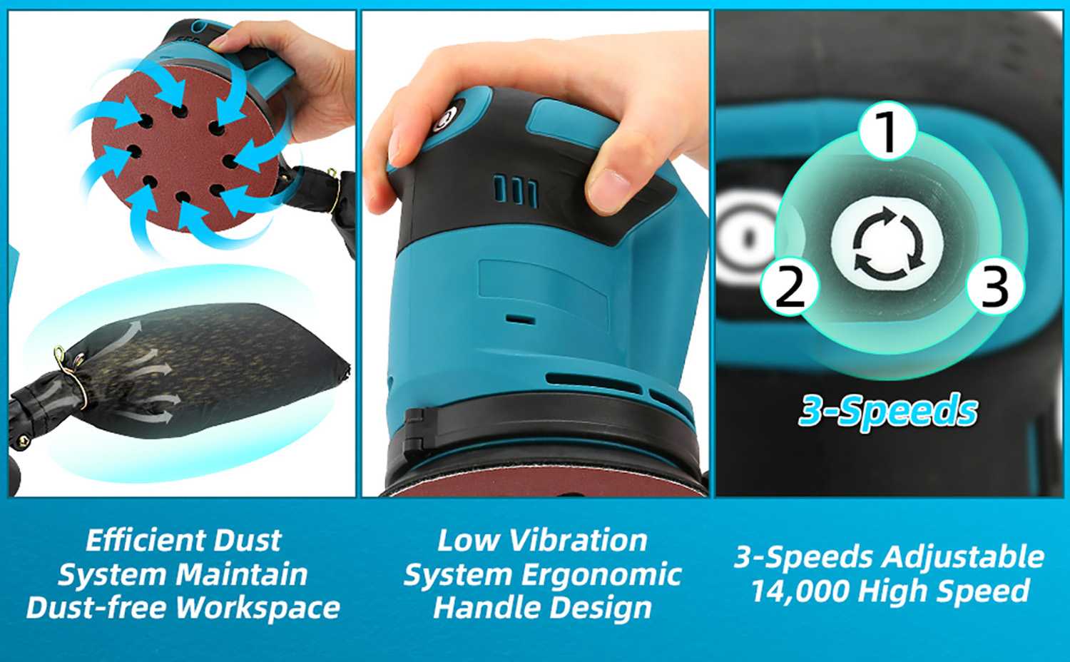----- 360W Powerful Motor: The upgraded brushless motor, elevates our random orbital sander to a robust 360 watts. Upgraded solid copper motor minimizes friction loss, ensuring more power, consistency, and up to 30% longer lifespan! ----- 3 Adjustable Speeds: The 3.0A electric orbital sander provides 3 variable speeds (6000-14000RPM), facilitating precise speed adjustments for woodworking sanding or polishing. It delivers a notable 30% efficiency boost, ensuring optimal performance across diverse tasks.