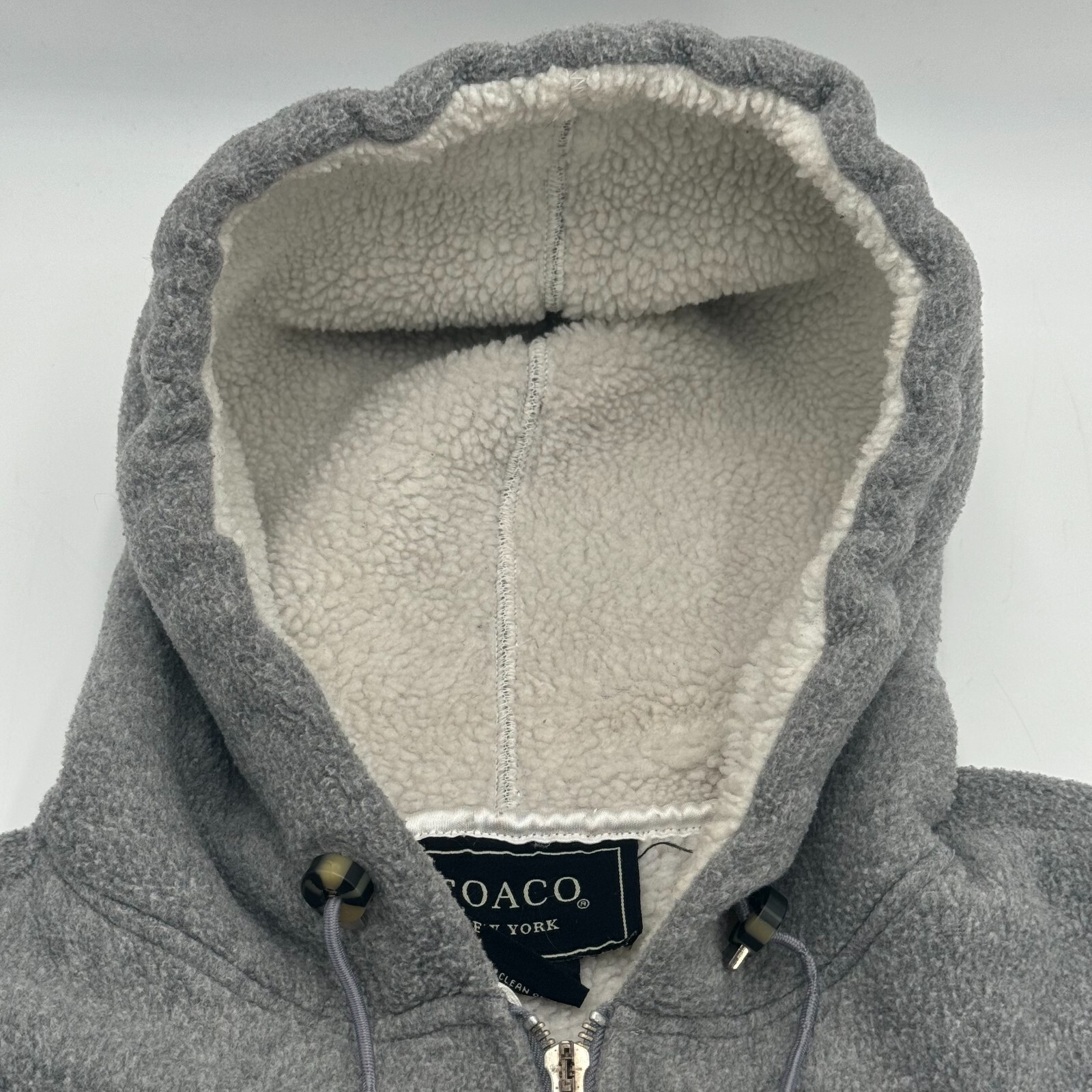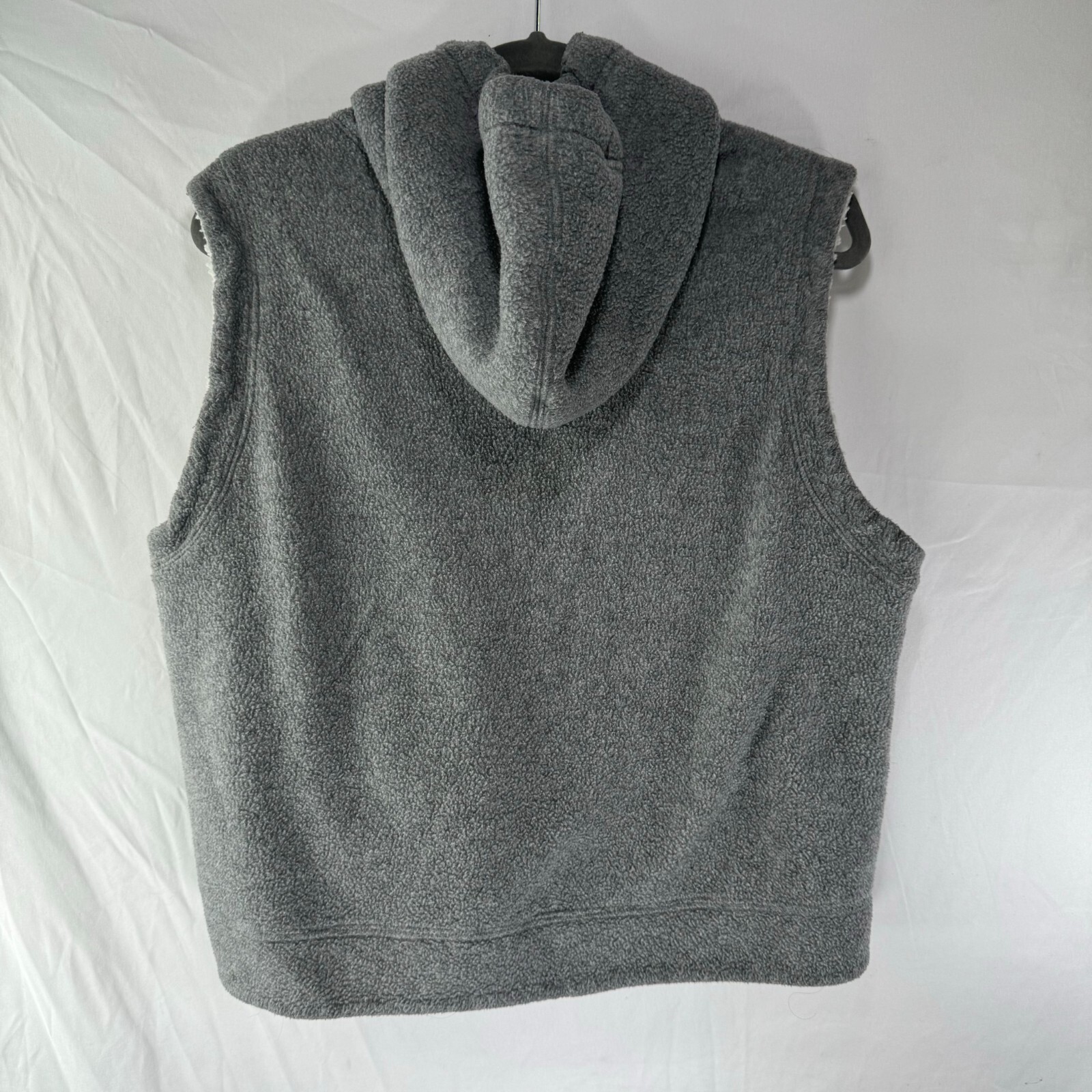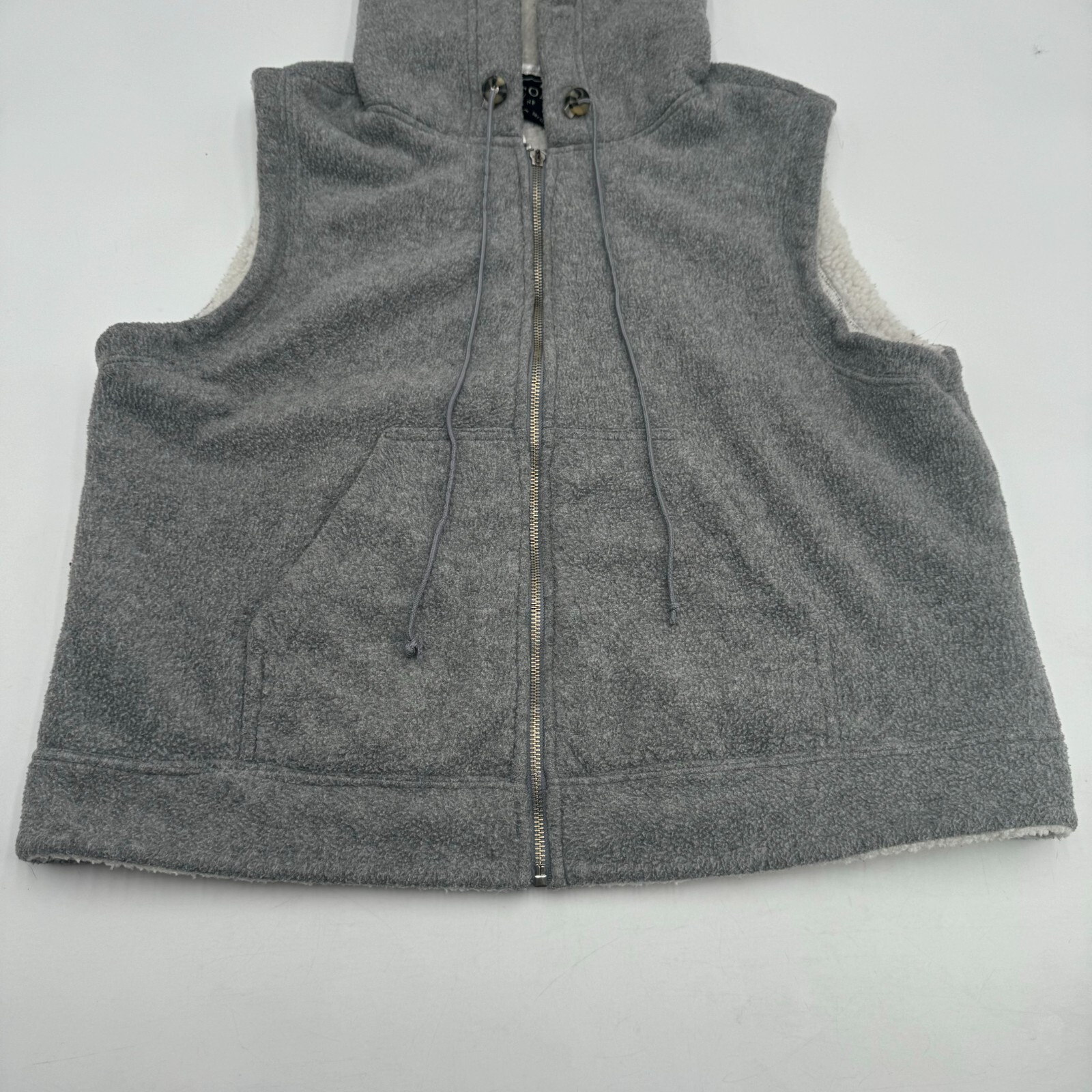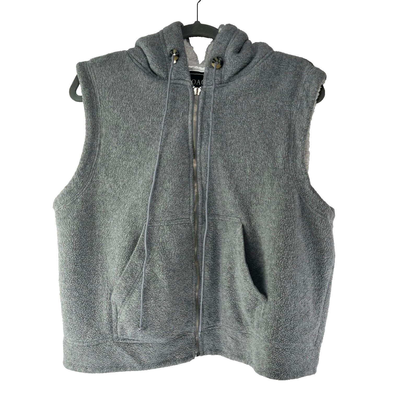 This is a Coaco hooded vest in light grey, made of soft and warm fleece polyester material.