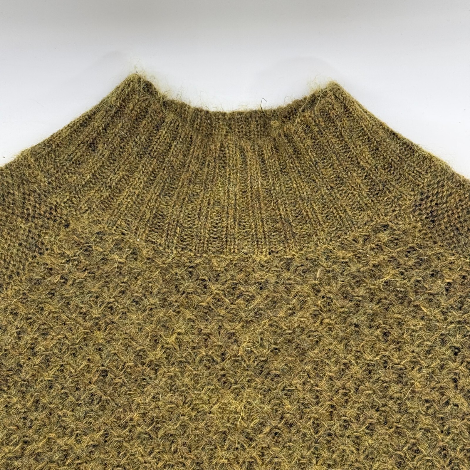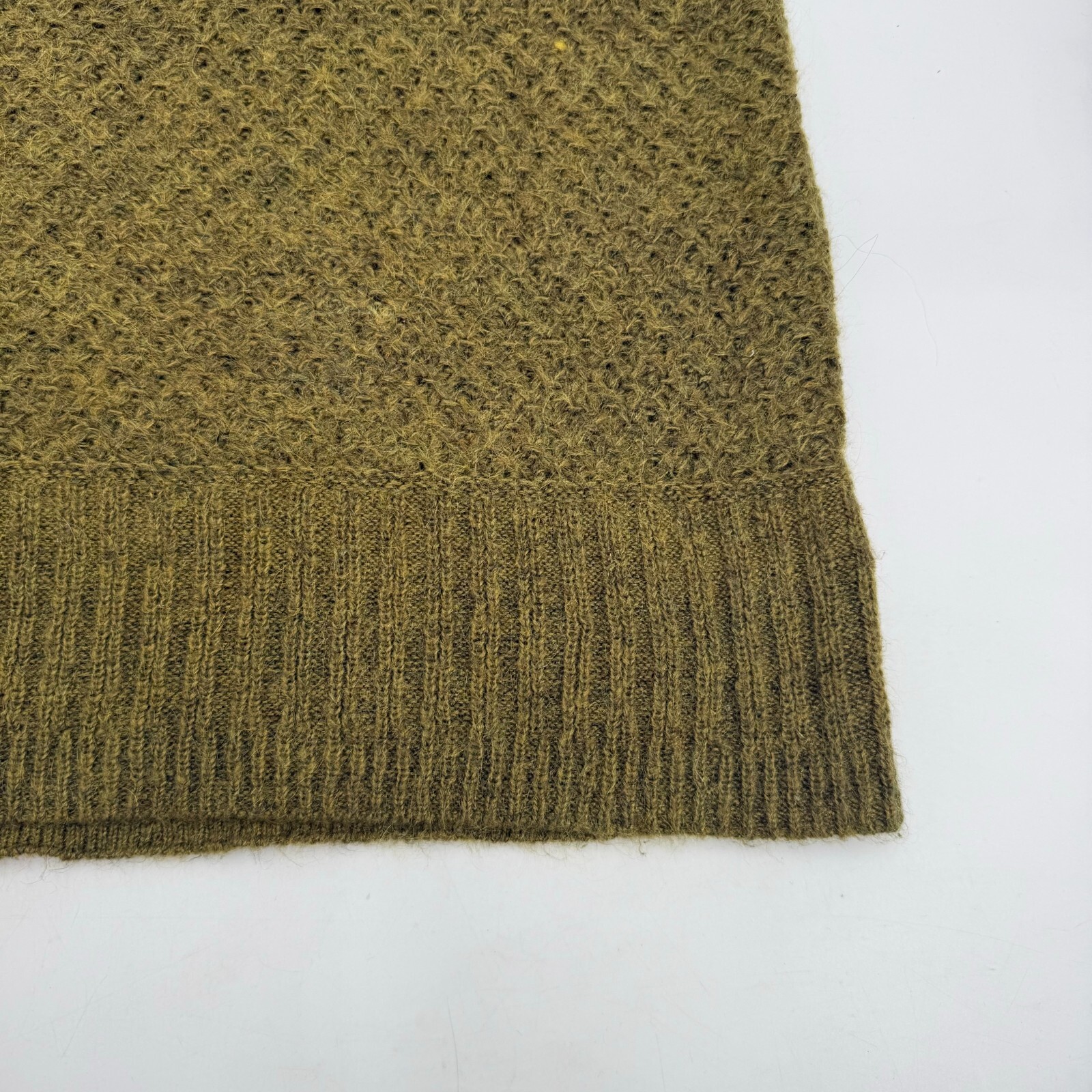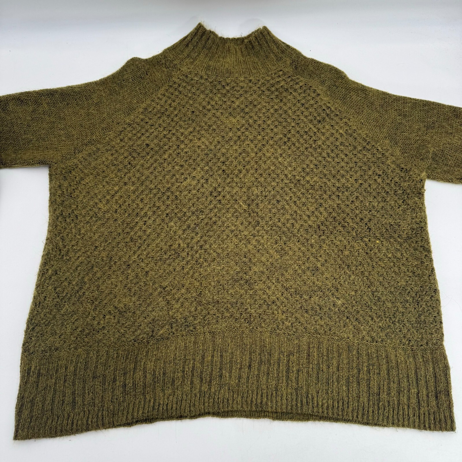 This olive green knitted jumper from H&M is a must-have for any fashion-forward woman. The pullover style and long sleeves make it perfect for cooler weather, while the knit fabric type adds a touch of texture and interest to the garment. The sweater is designed for a regular size fit and is available in women's size M.